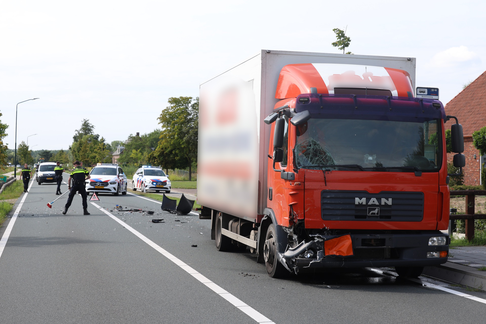Een vrachtwagen en een personenauto zijn deze middag op de Boxtelseweg met elkaar in aanrijding gekomen. Als gevolg van de botsing kwam de auto op het nabijgelegen fietspad terecht. De vrachtwagen bevond zich op de rijbaan, waarbij beide voertuigen aanzienlijke schade opliepen. De chauffeur van de vrachtwagen bleef ongedeerd, terwijl in de personenauto een moeder en twee kinderen aanwezig waren. De bestuurster van de personenauto en een van de kinderen zijn met onbekende verwondingen met spoed per ambulance vervoerd. Beide voertuigen zullen worden geborgen.