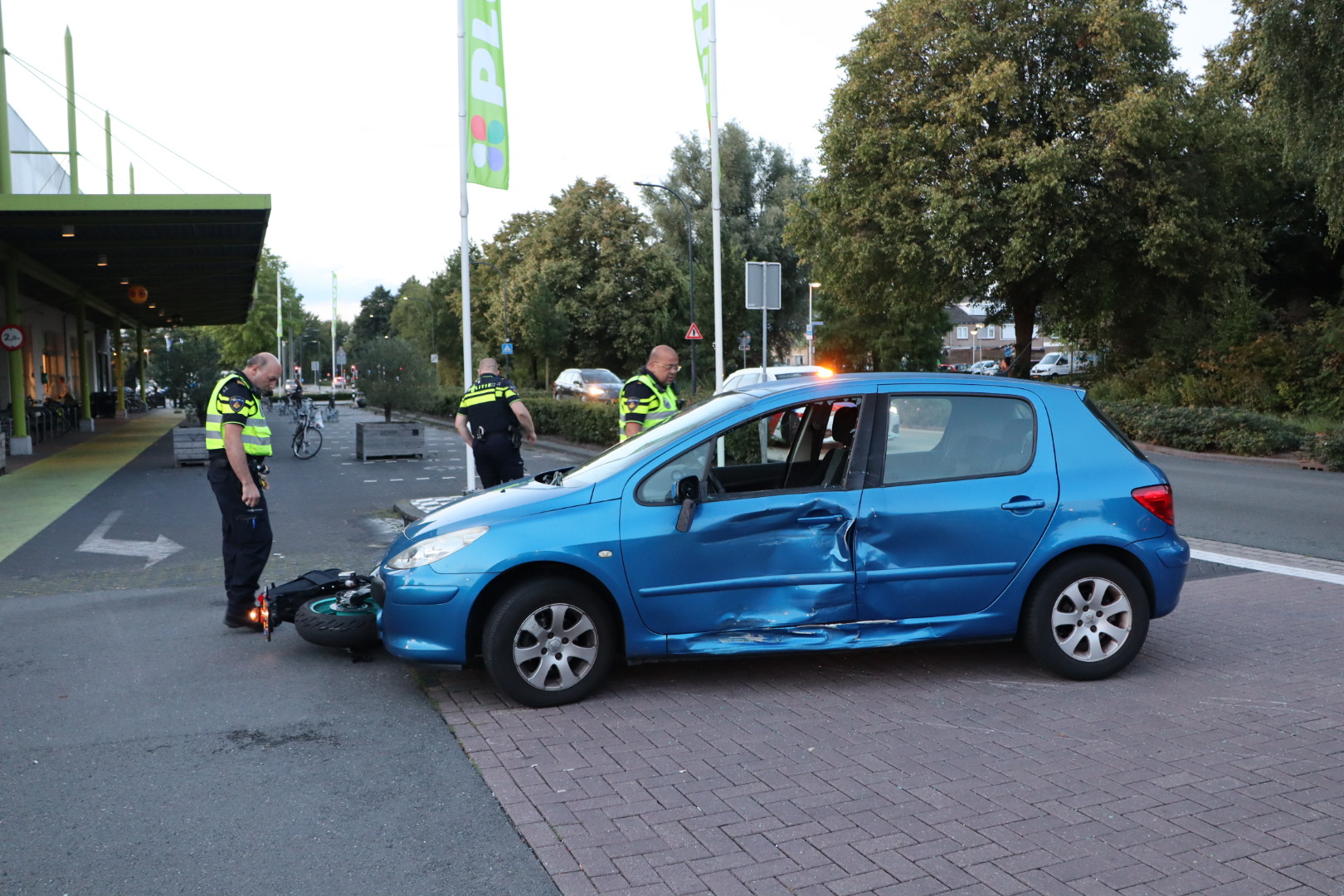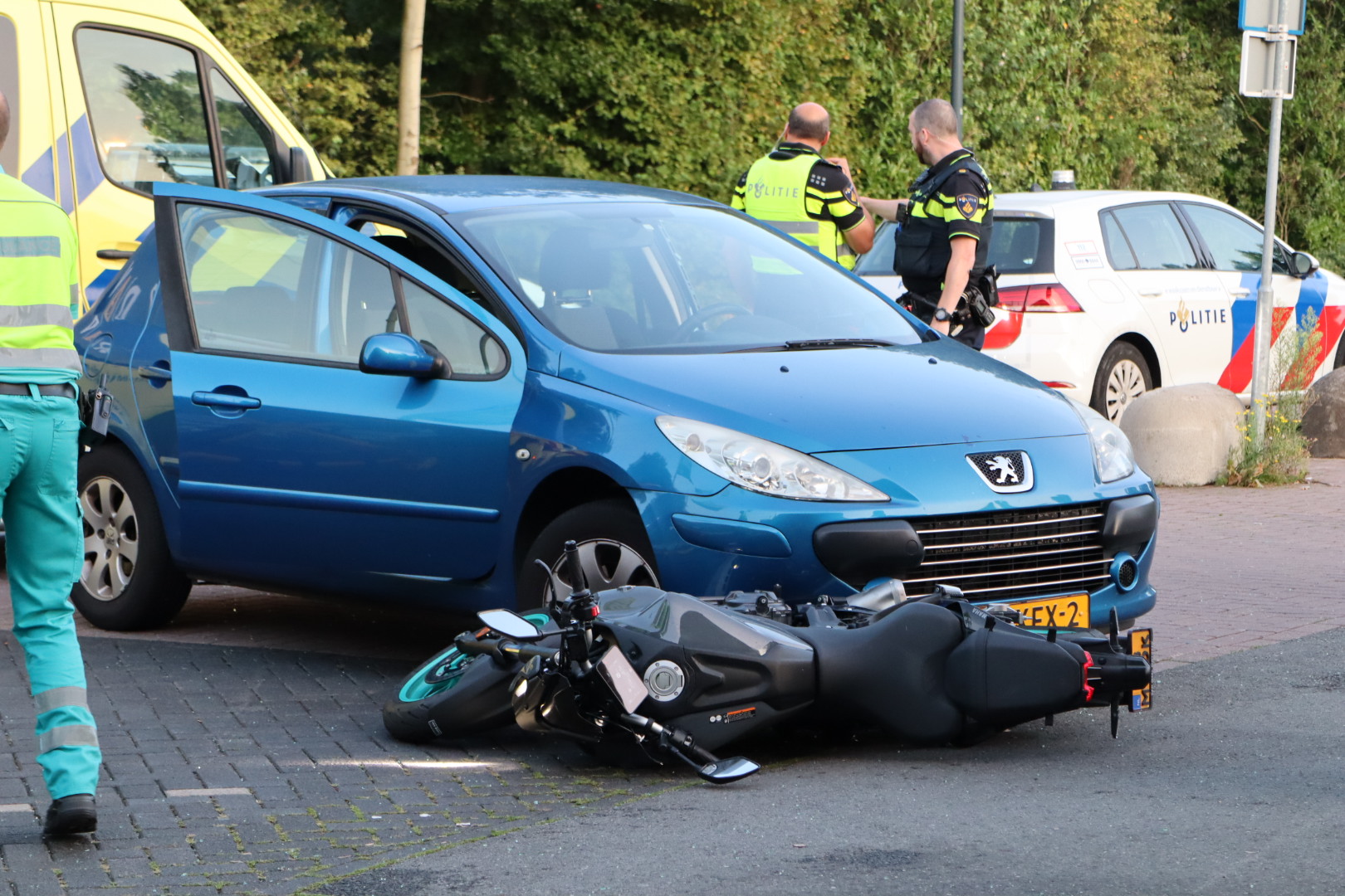 De motorrijder wilde een afslaande auto inhalen waarna er een flinke botsing ontstond. Het ongeval gebeurde nabij de Plus supermarkt. De motorrijder is gewond naar het ziekenhuis gebracht. De motor is 1.5 maand oud. De schade aan de auto is groot.