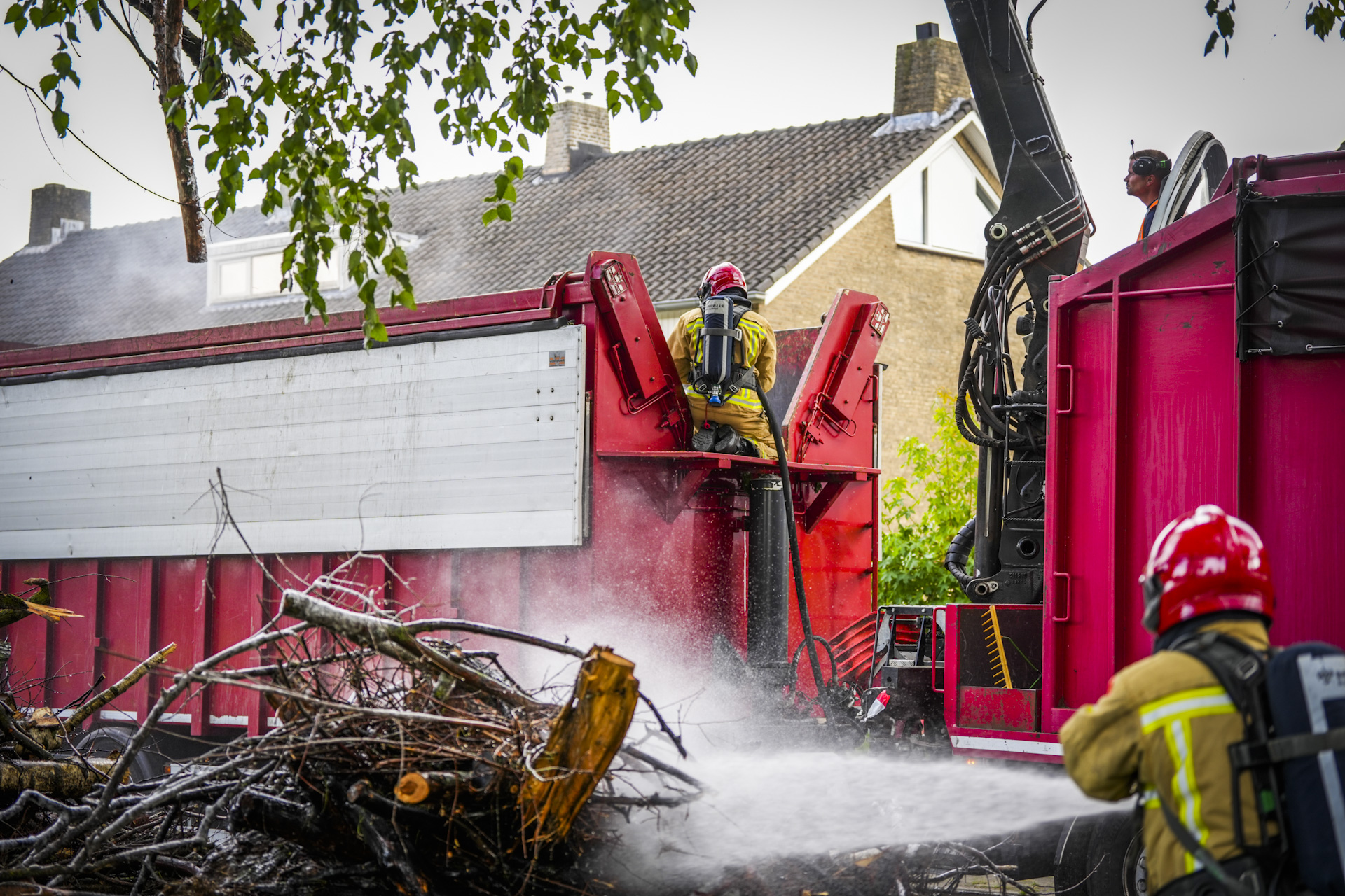 Niet veel later stond de bak met lading in brand, vermoedelijk door smeulende resten van het wespennest. Met twee grijpers werd het brandende hout met hoge snelheid uit de containers gehaald om te voorkomen dat de brand oversloeg naar de vrachtwagen waar het in lag. De brandweer heeft het hout afval in de bak, en daar buiten geblust en goed nat gemaakt voordat het terug in de truck kon.