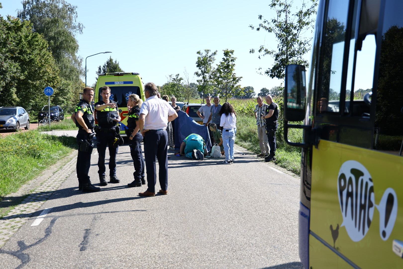 Een aanrijding was niet meer te voorkomen. De jonge dame gaat met een gebroken onderbeen per ambulance naar het ziekenhuis. Het verkeer wordt over het fietspad geleid.