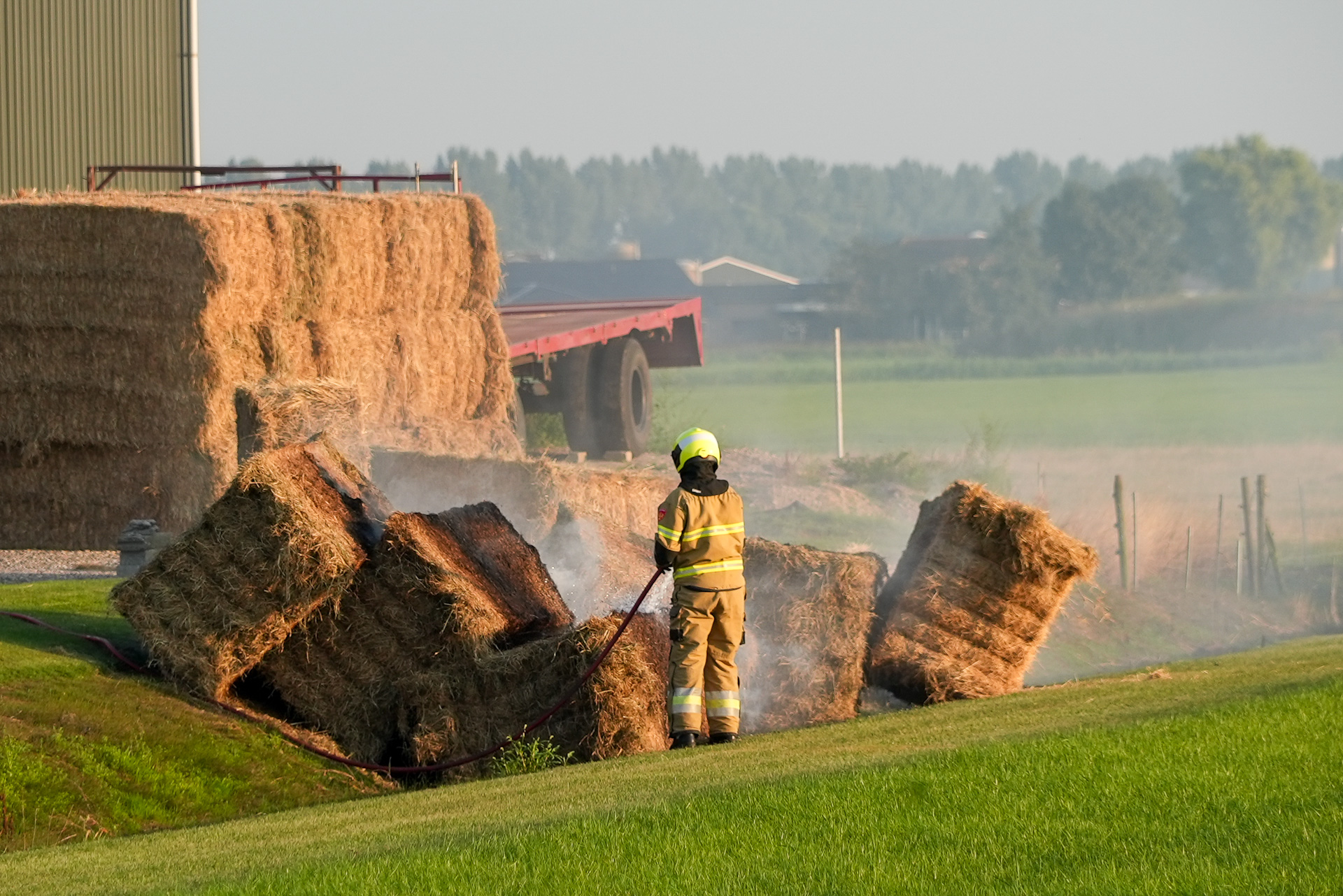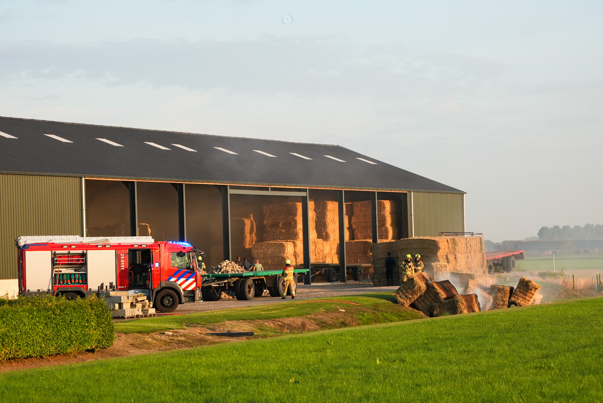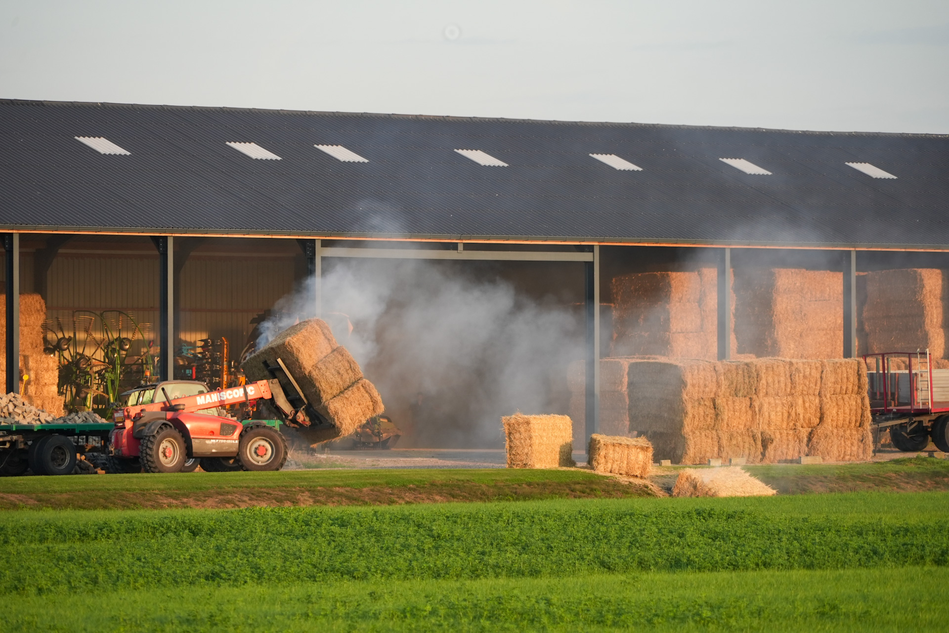 In de loods staan balen met stro opgeslagen. Deze zijn door nog onbekende oorzaak in brand gevlogen. De balen zijn met een verrijker uit de schuur gehaald. De brandweer is bezig om de balen te blussen.