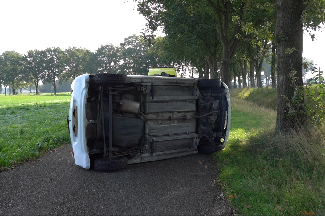 De automobiliste was vermoedelijk afgeleid tijdens het autorijden en reed tegen een boom. Haar auto belandde op zijn zijkant. De vrouw raakte gewond en werd met een ambulance naar het ziekenhuis vervoerd.