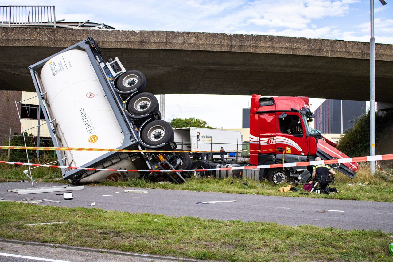 Tankwagen valt van viaduct, chauffeur gewond