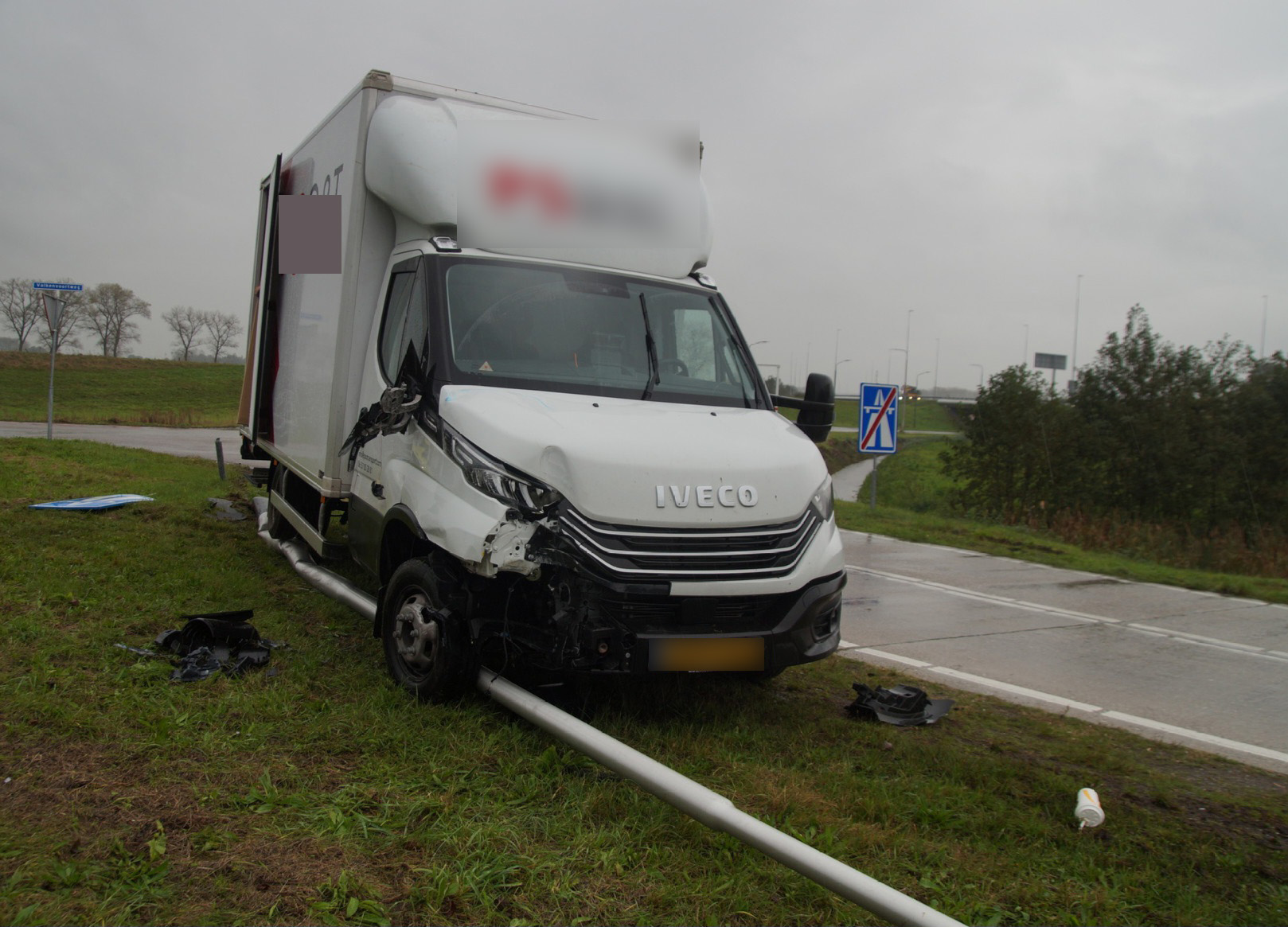 Bestelbus rijdt bord en lantaarnpaal uit de grond