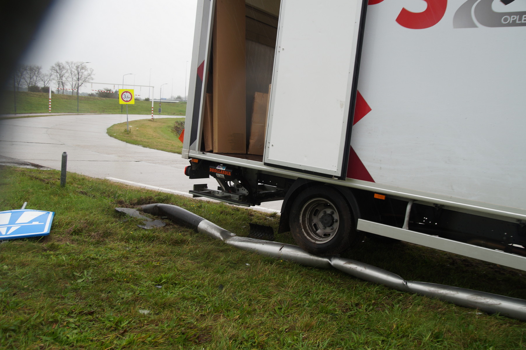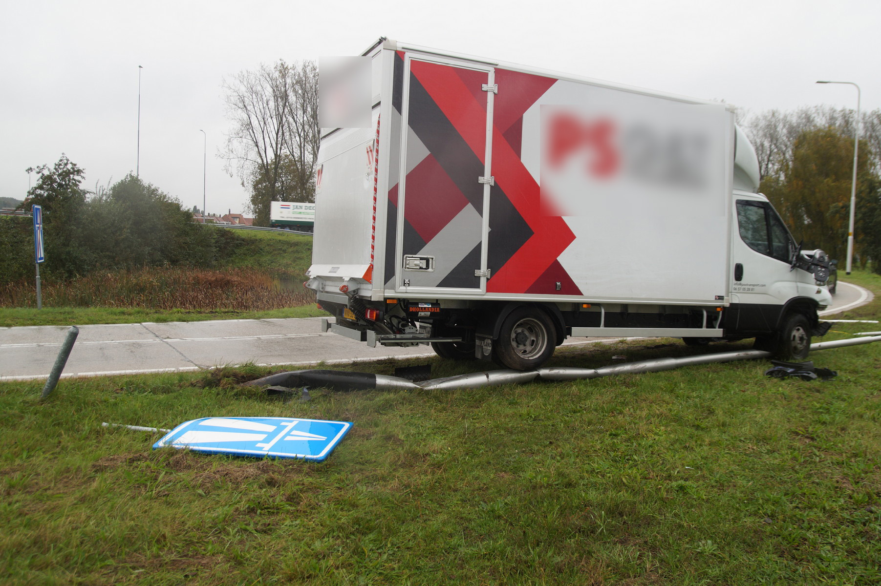 Een bestelbus heeft een verkeersbord en een lantaarnpaal omver gereden. Volgens de bestuurder gleed zijn voertuig weg en reed het rechtuit. De bestuurder raakte niet gewond, maar de auto liep aanzienlijke schade op.