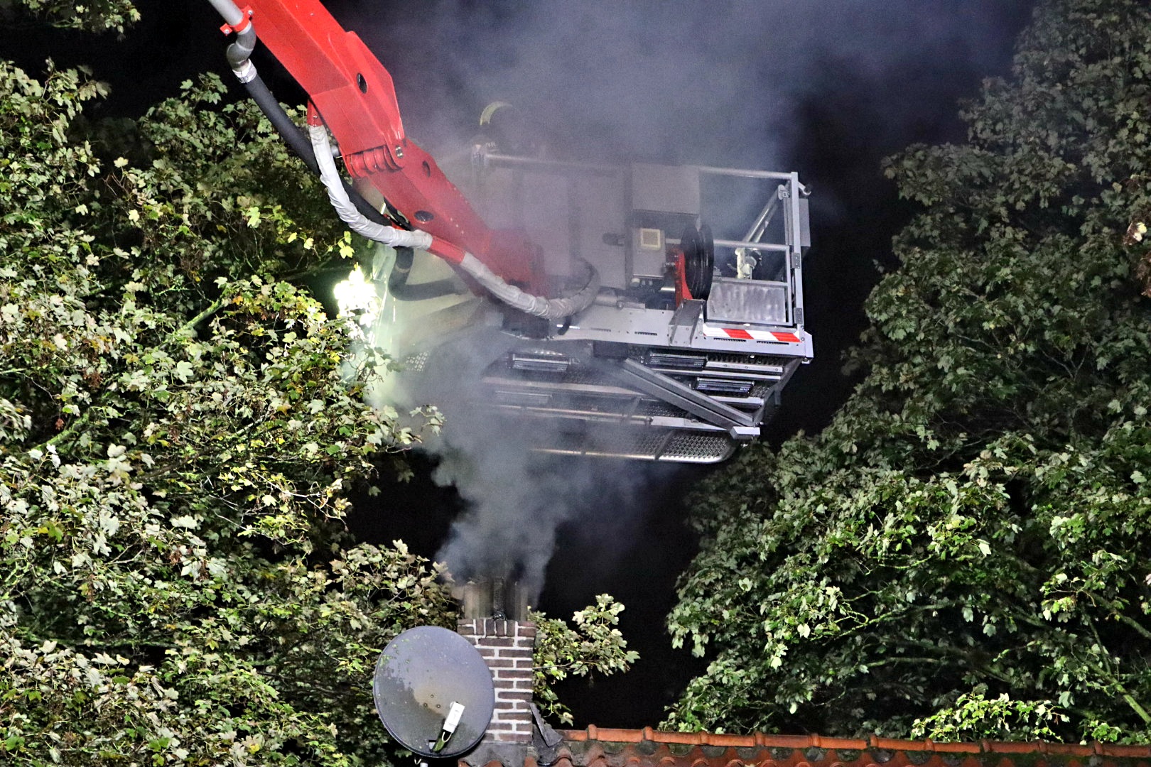 Bij aankomst van de brandweer kwamen er vlammen en vonken uit de schoorsteen. De brandweer ging met een hoogwerker naar de schoorsteen om deze te kunnen vegen. De brandweer moest binnen ook aan de slag en moesten de kachel verplaatsen. Bij het vegen van de schoorsteen kwam veel rook vrij.