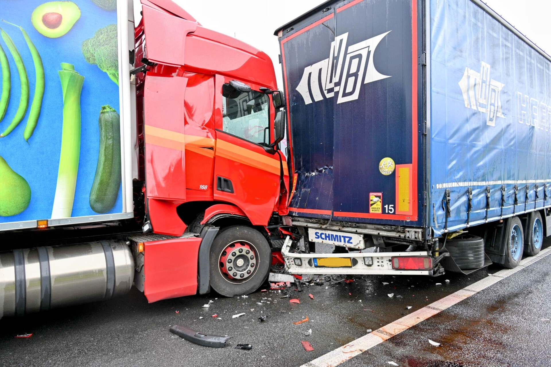 Veel schade na botsing tussen vrachtwagens