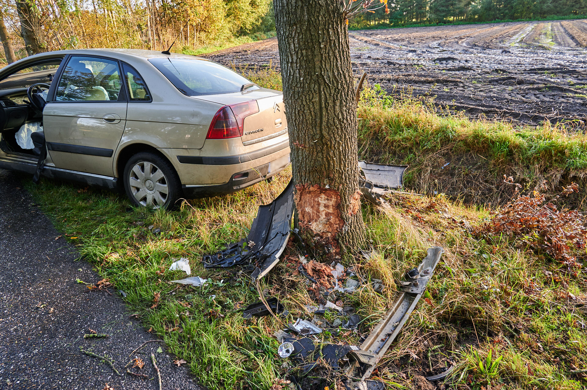 De botsing was zo krachtig dat een deel van de bast van de boom scheurde. Hoe de auto precies van de weg kon raken, is niet duidelijk.