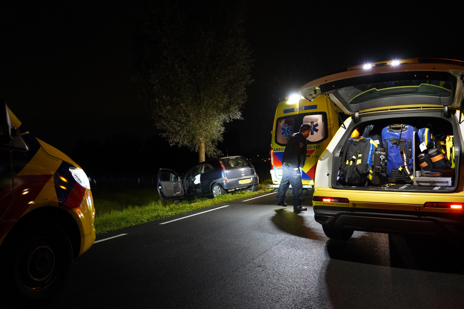 De eerste melding werd rond kwart voor 18:45 uur doorgegeven aan de alarmcentrale. Een auto is door onbekende oorzaak tegen een boom gereden. Na het ongeval zat de bestuurder bekneld in zijn voertuig. De ter plaatse gekomen brandweer heeft de bestuurder bevrijd door het portier te openen. Het Mobiel Medisch Team (MMT) was ook ter plaatse.