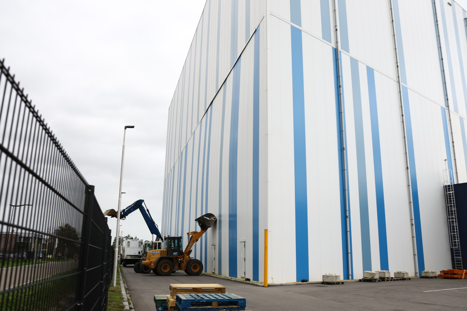 Vier grote machines wordt de wand tegengehouden. Er zijn hoogwerkers onderweg om de wand te kunnen vastzetten. De straat is gedeeltelijk afgesloten voor verkeer.