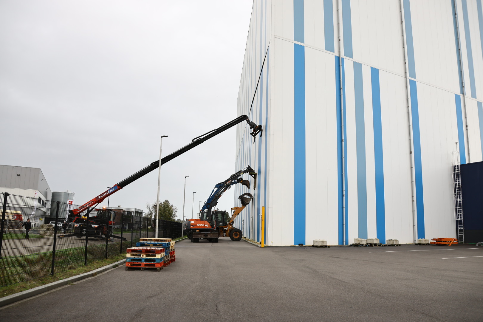 Vier grote machines wordt de wand tegengehouden. Er zijn hoogwerkers onderweg om de wand te kunnen vastzetten. De straat is gedeeltelijk afgesloten voor verkeer.