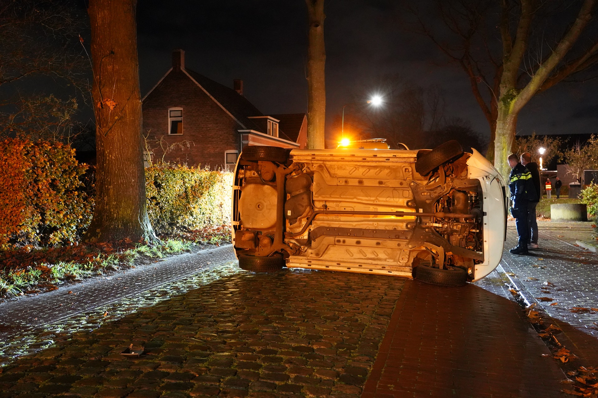 Een automobiliste verloor de macht over het stuur en botste tegen een boom. Door de klap belandde de auto op zijn kant. De twee inzittenden konden door de voorruit de auto verlaten. Een ambulance kwam ter plaatse en heeft de inzittenden nagekeken. Ze raakten bij het ongeval niet gewond maar waren wel flink geschrokken.
