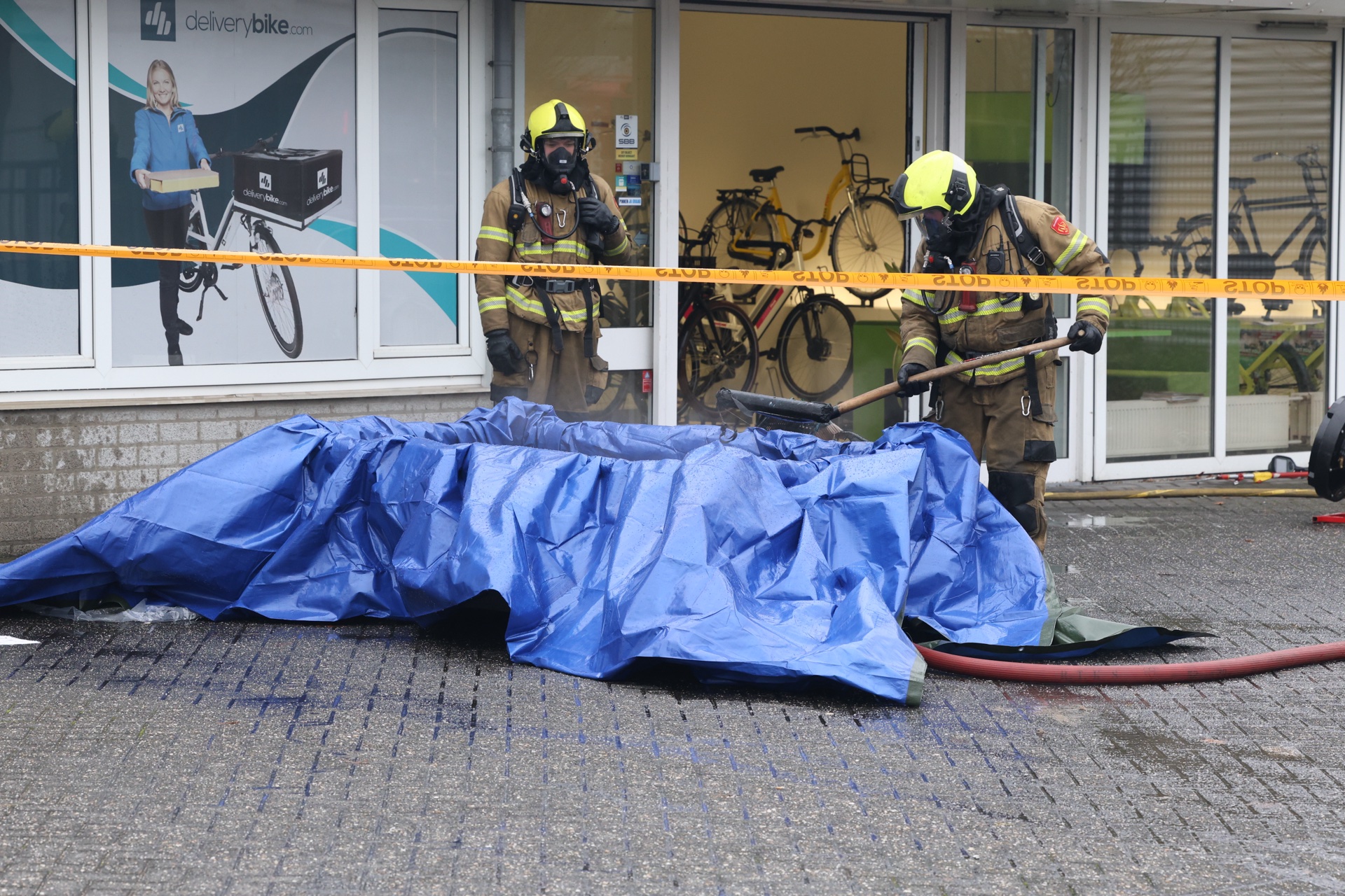 Voor de fietsaccu’s is een dompelbad ingezet om herontbranding te voorkomen. De winkel heeft aanzienlijke rook- en waterschade opgelopen.