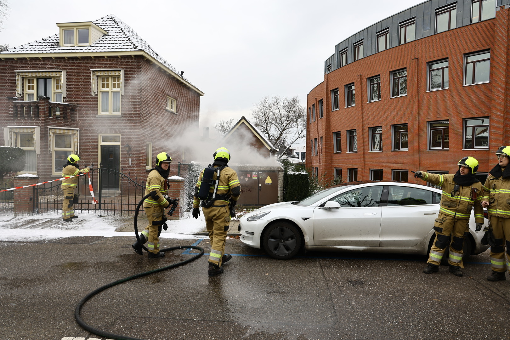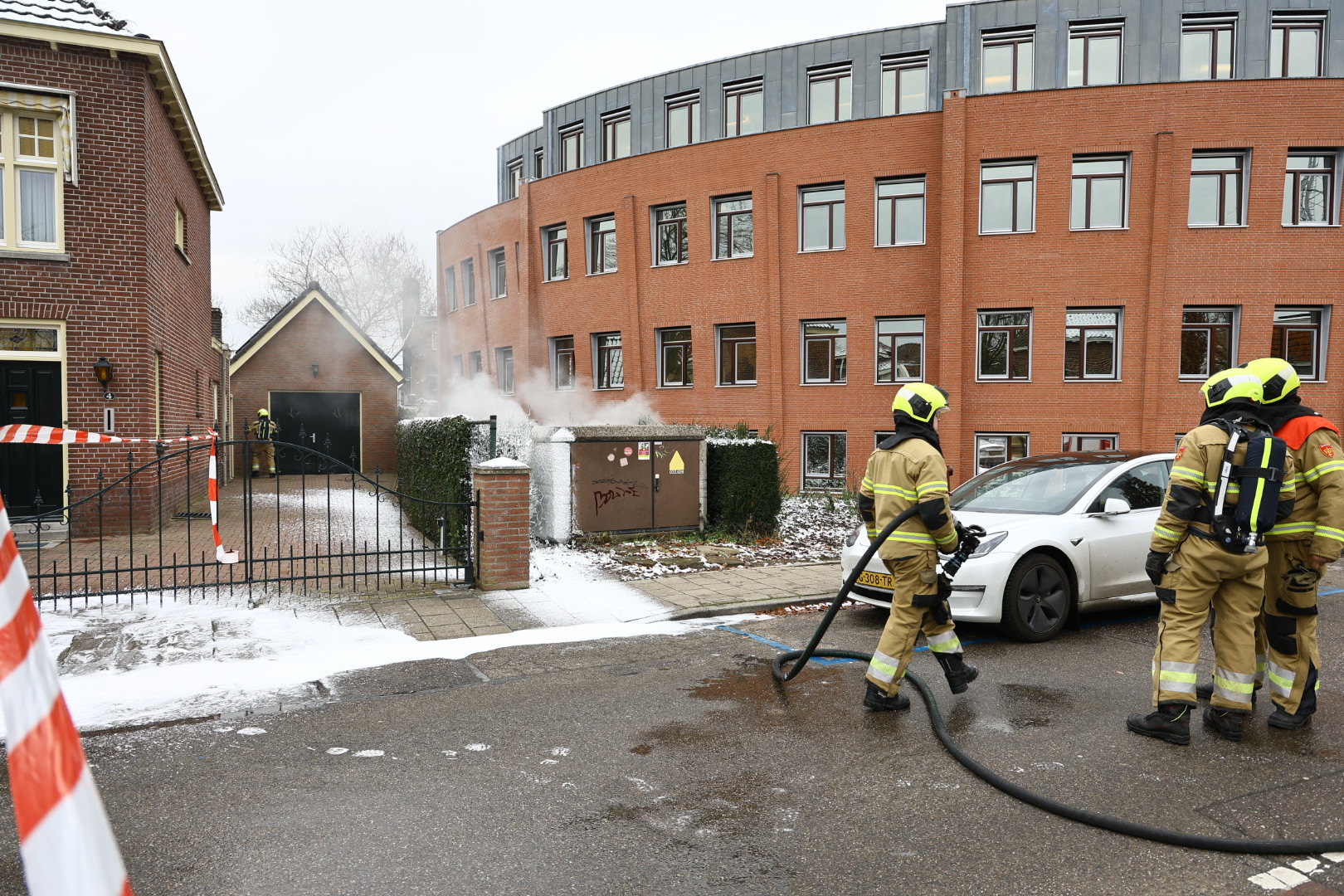 Er wordt geblust met schuim. De straat is afgesloten, de naastgelegen huizen en het gemeentehuis hebben geen stroom meer. Enexis is op de plek van de brand. De brand gaat gepaard met veel knallen.