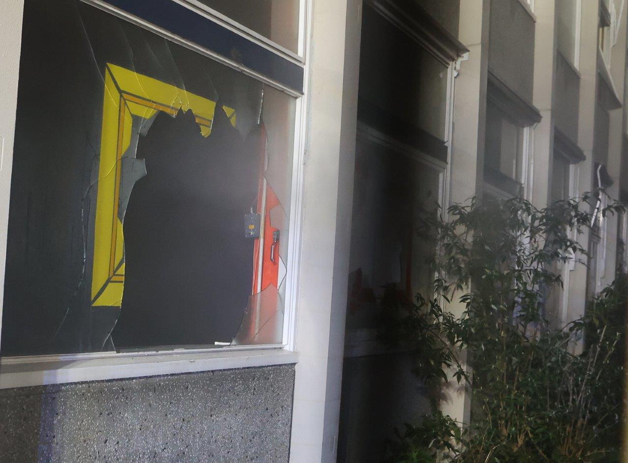 Bijna alle ramen van de oude school zijn inmiddels ingegooid.