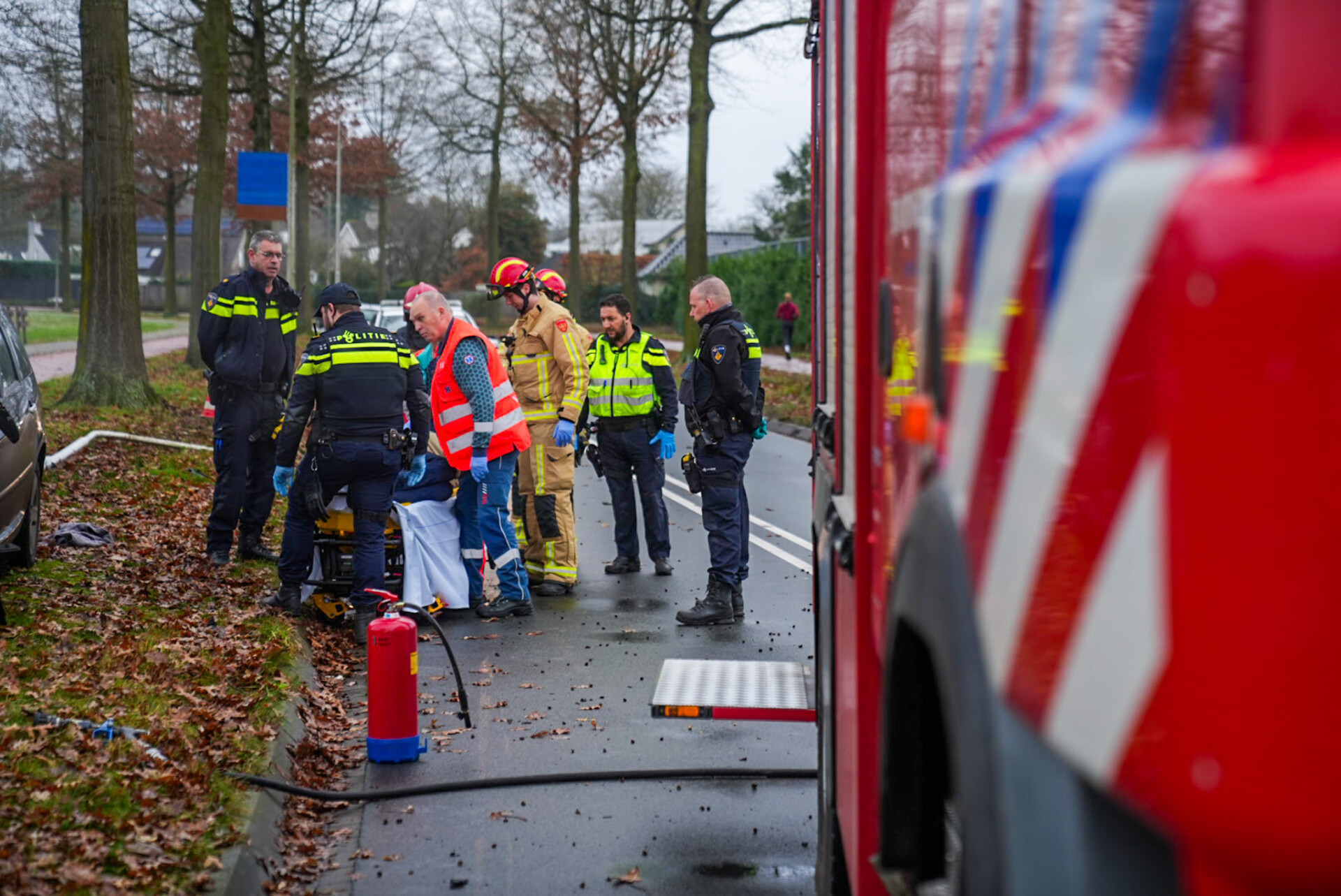 Verschillende hulpdiensten werden gealarmeerd, en het slachtoffer werd met een ambulance naar het ziekenhuis vervoerd. De auto raakte aanzienlijk beschadigd bij het incident.