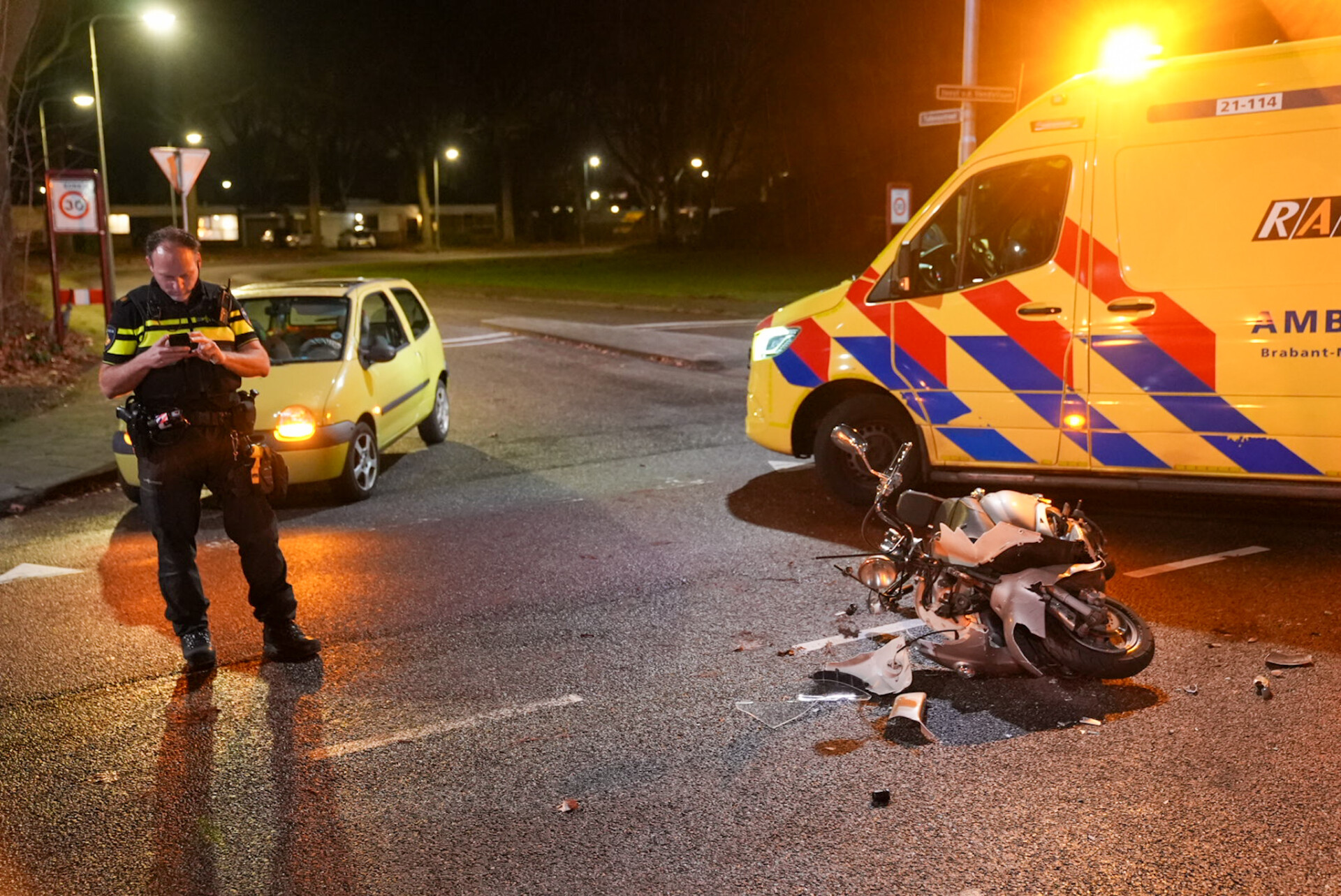 Een scooter is aangereden door een auto. De scooter raakte zwaar beschadigd. Een slachtoffer is per ambulance vervoerd voor medische behandeling.