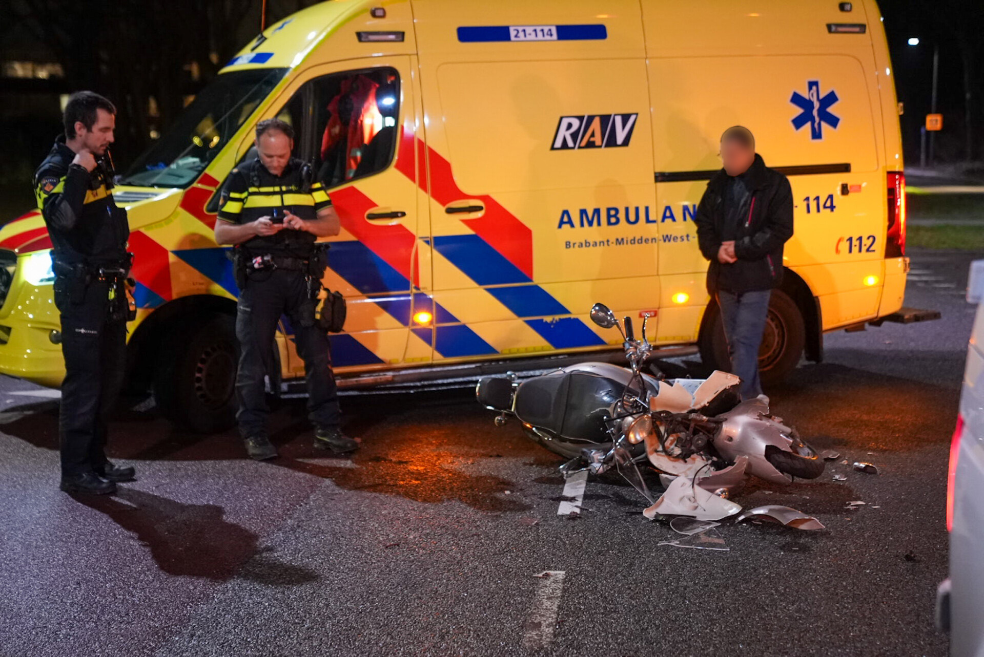 Een scooter is aangereden door een auto. De scooter raakte zwaar beschadigd. Een slachtoffer is per ambulance vervoerd voor medische behandeling.