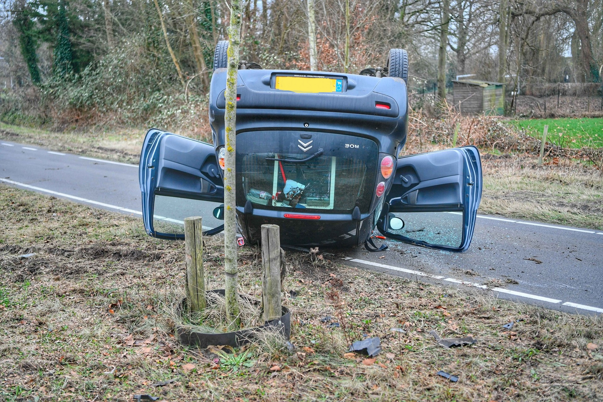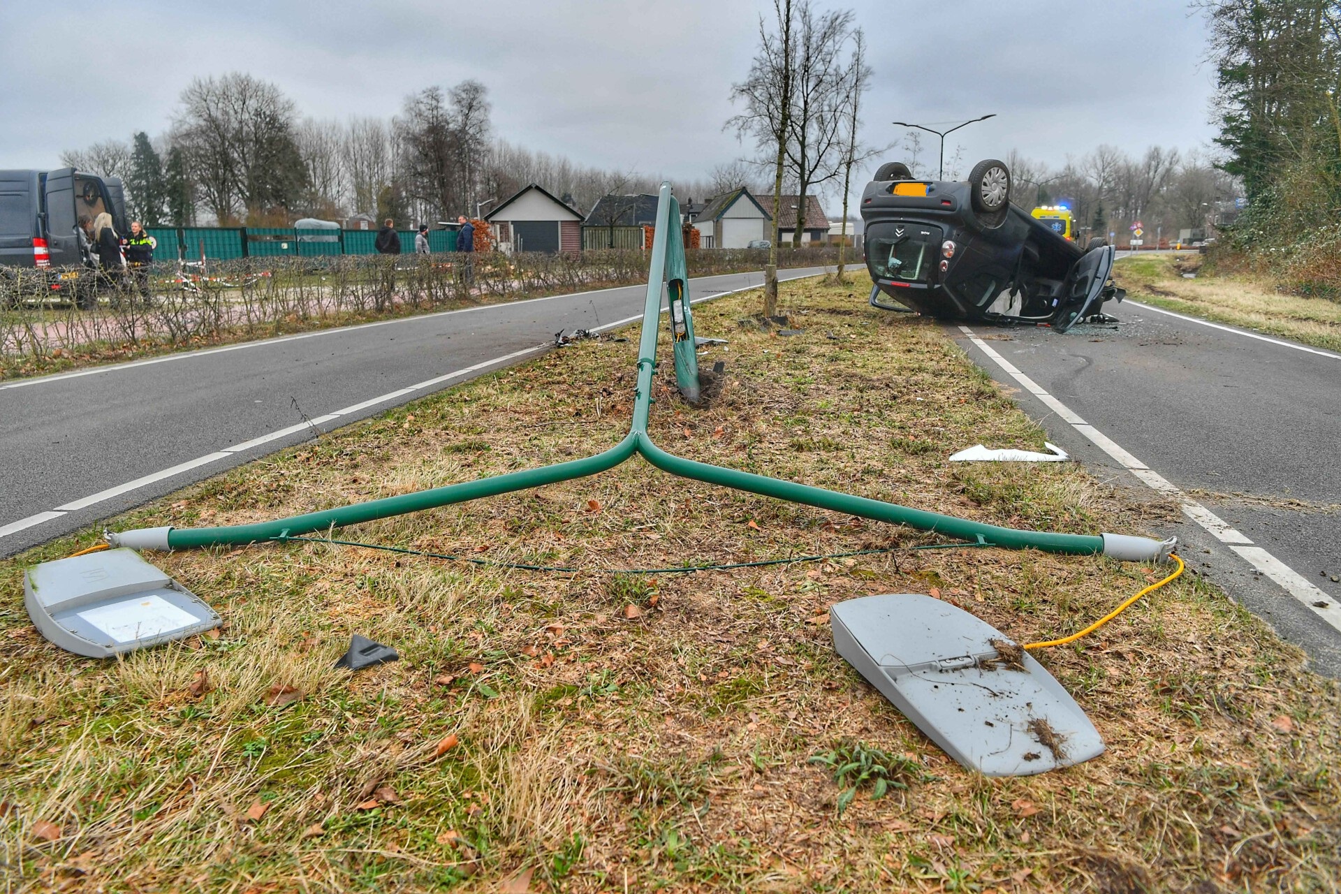 Auto over de kop na botsing tegen lantaarnpaal