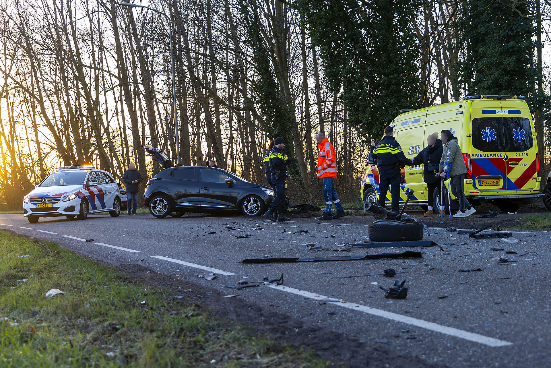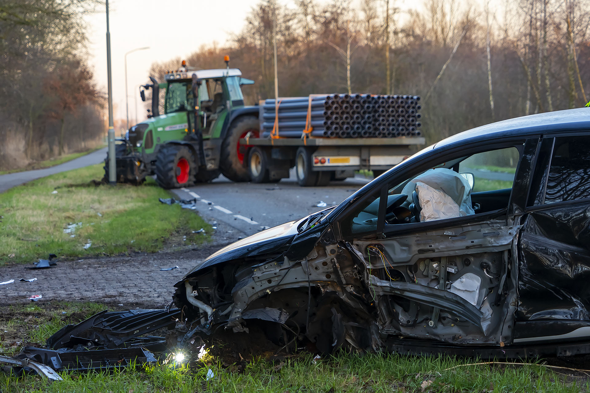 Rond 16.15 uur botsten een auto en een tractor in een flauwe bocht met hun linker voorzijden op elkaar. Dit resulteerde in aanzienlijke schade en een chaotische situatie. De tractor liep een beschadigde velg en band op, terwijl de auto volledig werd vernield. Op de weg lagen brokstukken en zelfs een wiel van de auto verspreid. De bestuurder van de tractor liep een hoofdwond op, maar kon ter plaatse worden behandeld door ambulancepersoneel en hoefde niet naar het ziekenhuis te worden vervoerd. De bestuurder van de zwaar beschadigde Renault Clio kwam er zelfs zonder lichamelijk letsel vanaf en ontsnapte enkel aan de schrik. Na het ongeval vreesde hij even dat zijn auto in brand zou kunnen vliegen, omdat er rook vrijkwam, maar dit bleek vermoedelijk afkomstig van de geactiveerde airbags. Volgens beide bestuurders verschilden hun verklaringen over de toedracht van het ongeval, wat nader onderzoek door hun verzekeringsmaatschappijen vereist.