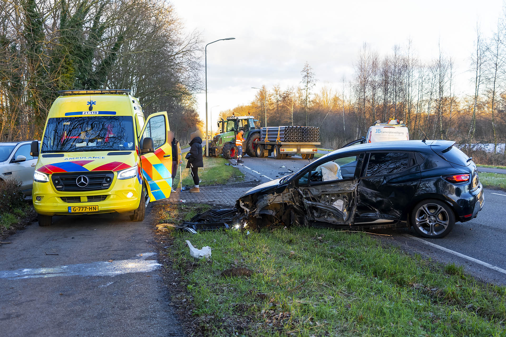 Rond 16.15 uur botsten een auto en een tractor in een flauwe bocht met hun linker voorzijden op elkaar. Dit resulteerde in aanzienlijke schade en een chaotische situatie. De tractor liep een beschadigde velg en band op, terwijl de auto volledig werd vernield. Op de weg lagen brokstukken en zelfs een wiel van de auto verspreid. De bestuurder van de tractor liep een hoofdwond op, maar kon ter plaatse worden behandeld door ambulancepersoneel en hoefde niet naar het ziekenhuis te worden vervoerd. De bestuurder van de zwaar beschadigde Renault Clio kwam er zelfs zonder lichamelijk letsel vanaf en ontsnapte enkel aan de schrik. Na het ongeval vreesde hij even dat zijn auto in brand zou kunnen vliegen, omdat er rook vrijkwam, maar dit bleek vermoedelijk afkomstig van de geactiveerde airbags. Volgens beide bestuurders verschilden hun verklaringen over de toedracht van het ongeval, wat nader onderzoek door hun verzekeringsmaatschappijen vereist.