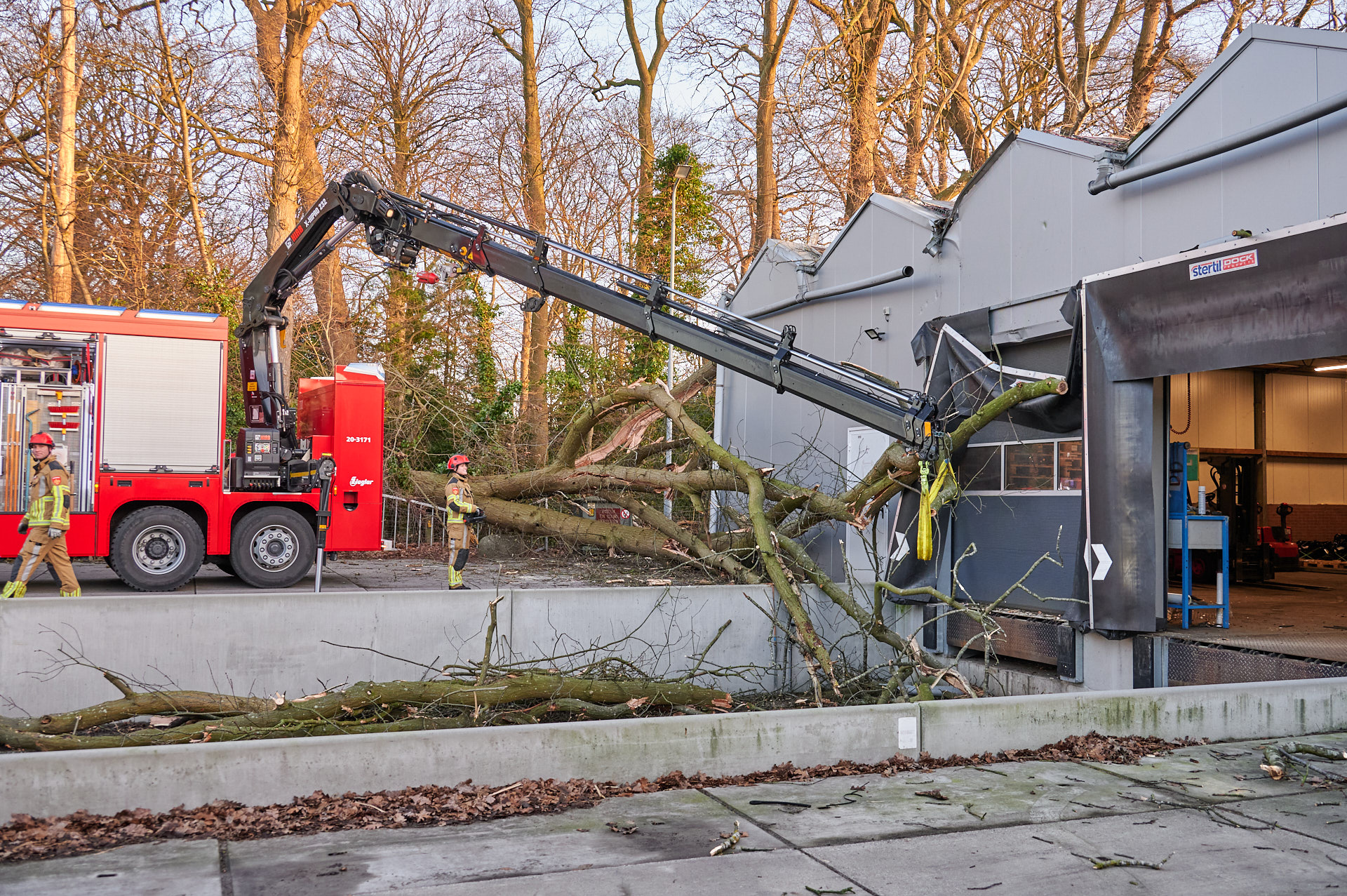 In de nacht van maandag op dinsdag was er door de harde wind een boom omgewaaid. De boom kwam deels op het pand en een vrachtwagen. De brandweer heeft met een kraan en een hoogwerker de boom verwijderd en in stukken gezaagd.