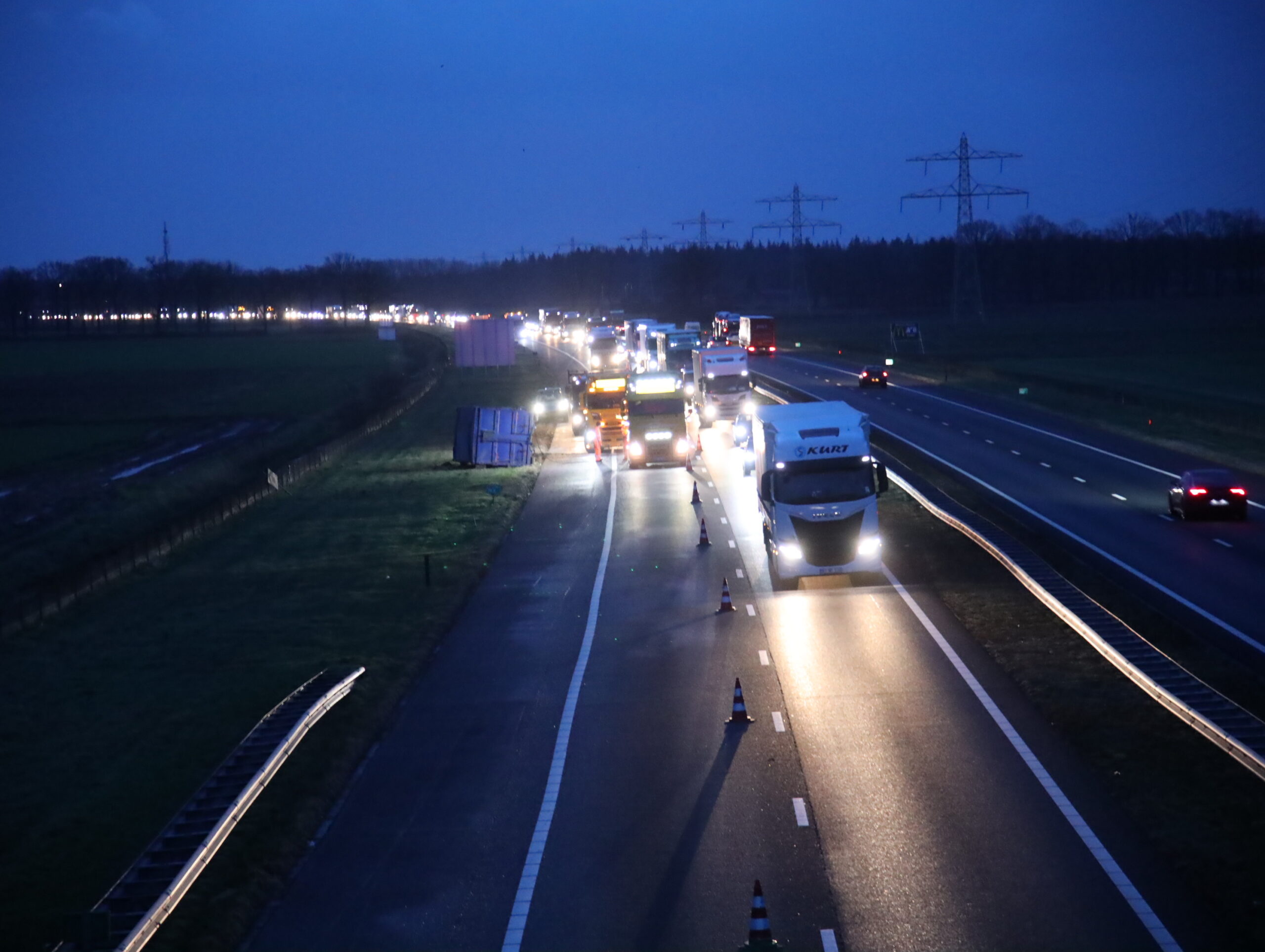 De berging is in volle gang. Een rijbaan is open voor het verkeer wat tot een lange file veroorzaakt. De chauffeur komt met de schrik vrij. De berging duurt nog tot ongeveer 10:00 uur volgens Rijkswaterstaat.