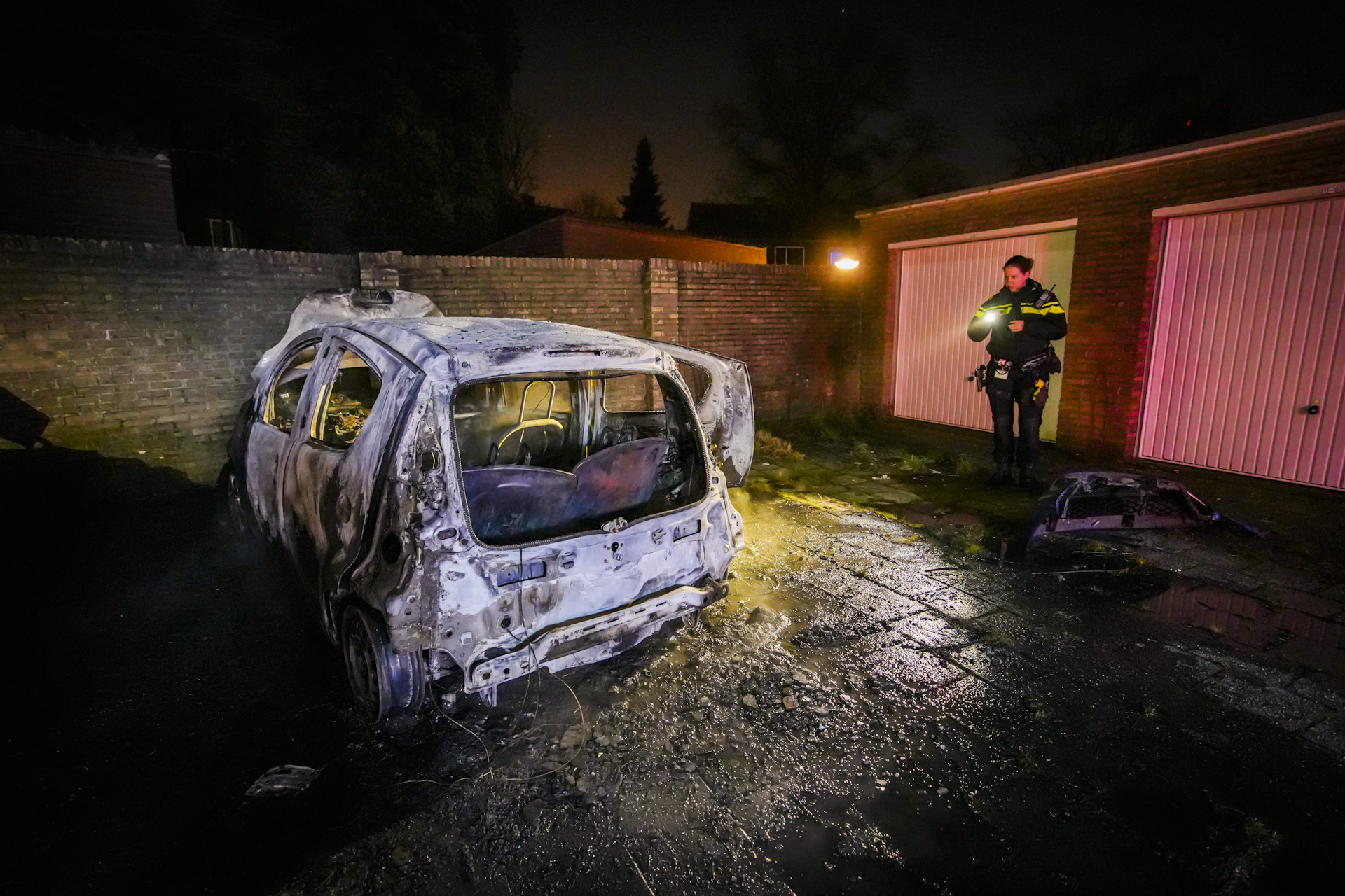 Bij aankomst van de brandweer was de auto al grotendeels verwoest. Dit is de derde auto die vanavond ten prooi is gevallen aan vlammen, en volgt op eerdere autobranden vorige week in het noordelijke deel van de stad.