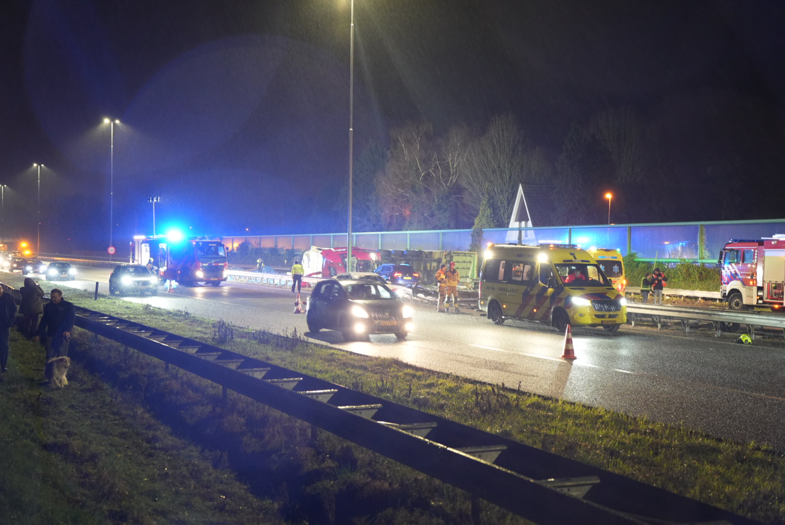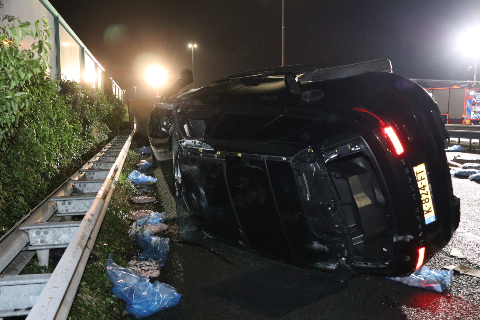 De politie heeft twee mannen uit de Range Rover aangehouden en meldt dat er verboden middelen in de auto lagen. De afsluiting van de snelweg wordt tot zondagochtend verwacht, met verkeer richting Den Bosch dat via de vluchtstrook wordt geleid.