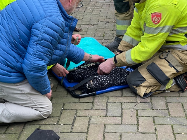 Samen met de dierenambulance is geprobeerd om de ree terug in het bos te zetten. Bij het loslaten werd al snel duidelijk dat het gewond is geraakt aan een heup. Er is toen weer besloten om de ree te vangen en op een brancard naar een wildopvang te brengen.