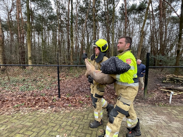 Samen met de dierenambulance is geprobeerd om de ree terug in het bos te zetten. Bij het loslaten werd al snel duidelijk dat het gewond is geraakt aan een heup. Er is toen weer besloten om de ree te vangen en op een brancard naar een wildopvang te brengen.