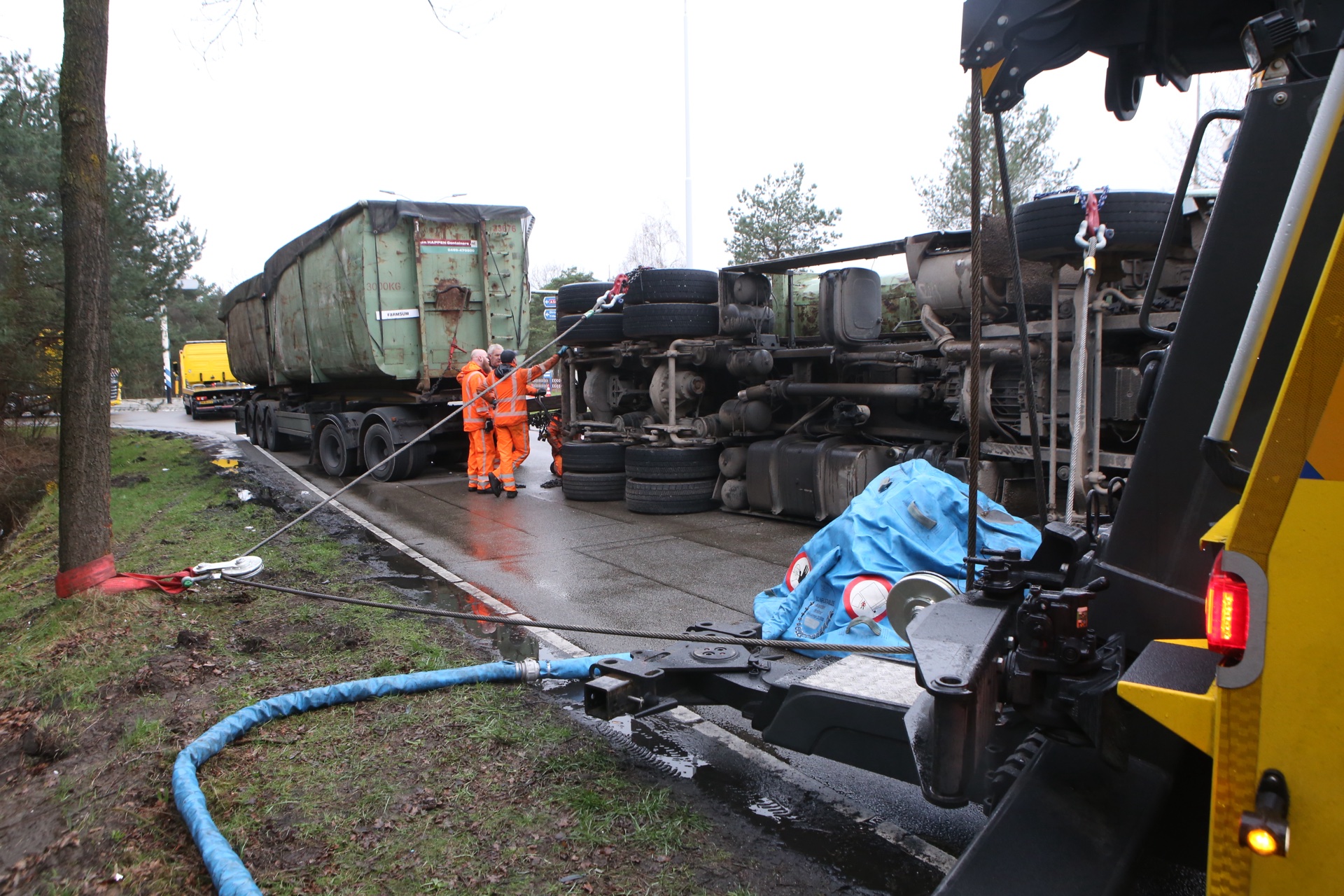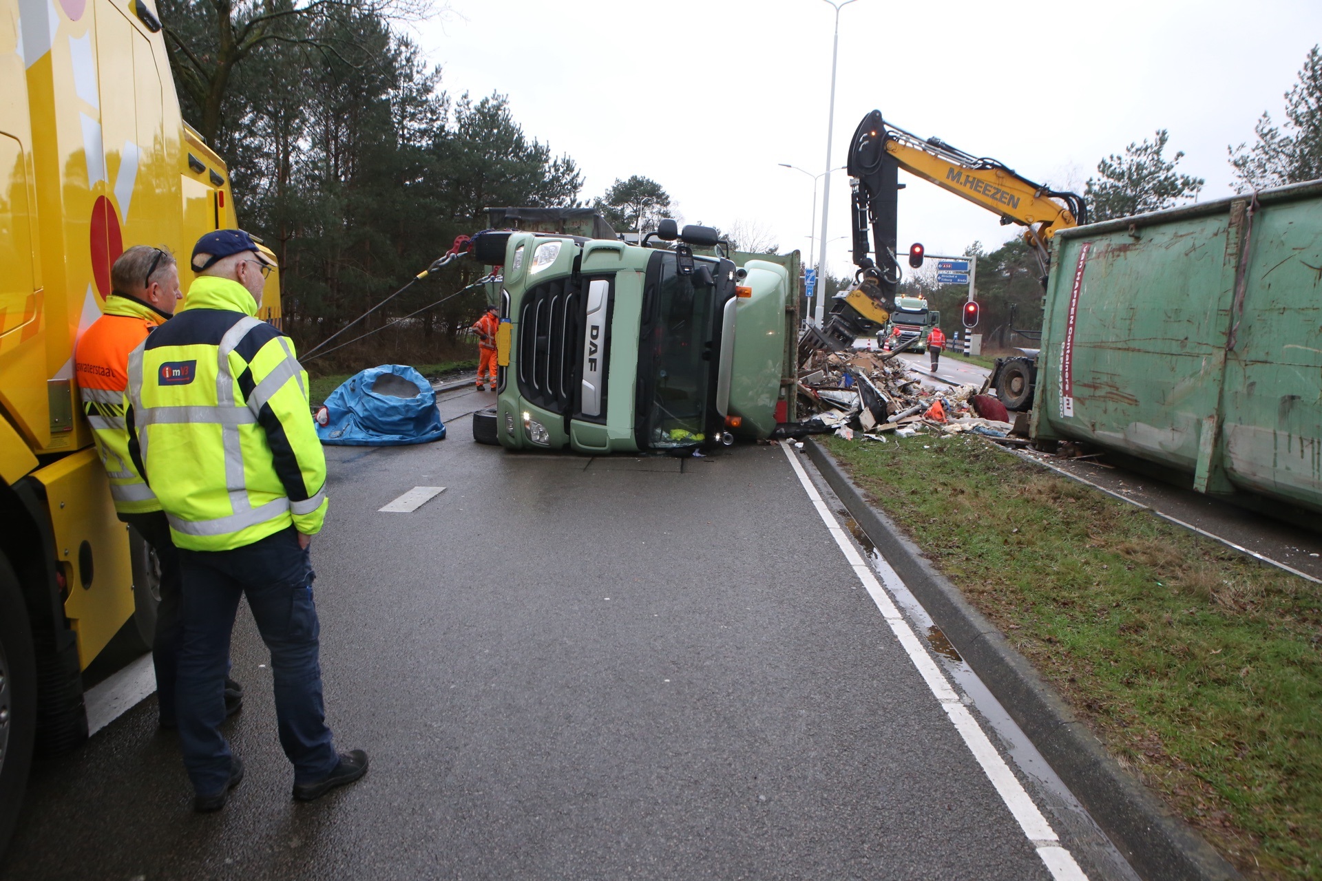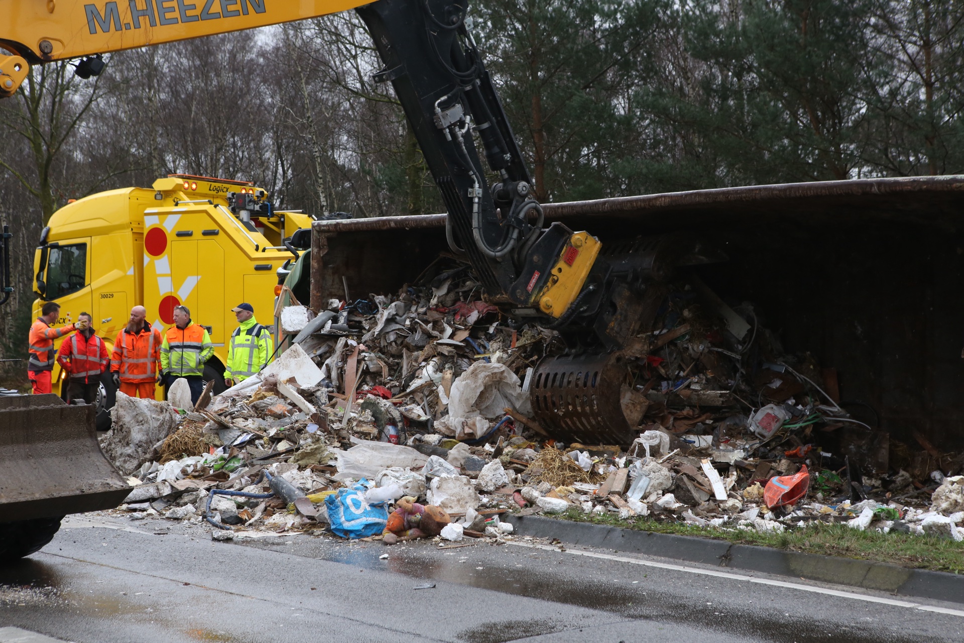 Vrachtwagen met afval kantelt, chauffeur ongedeerd