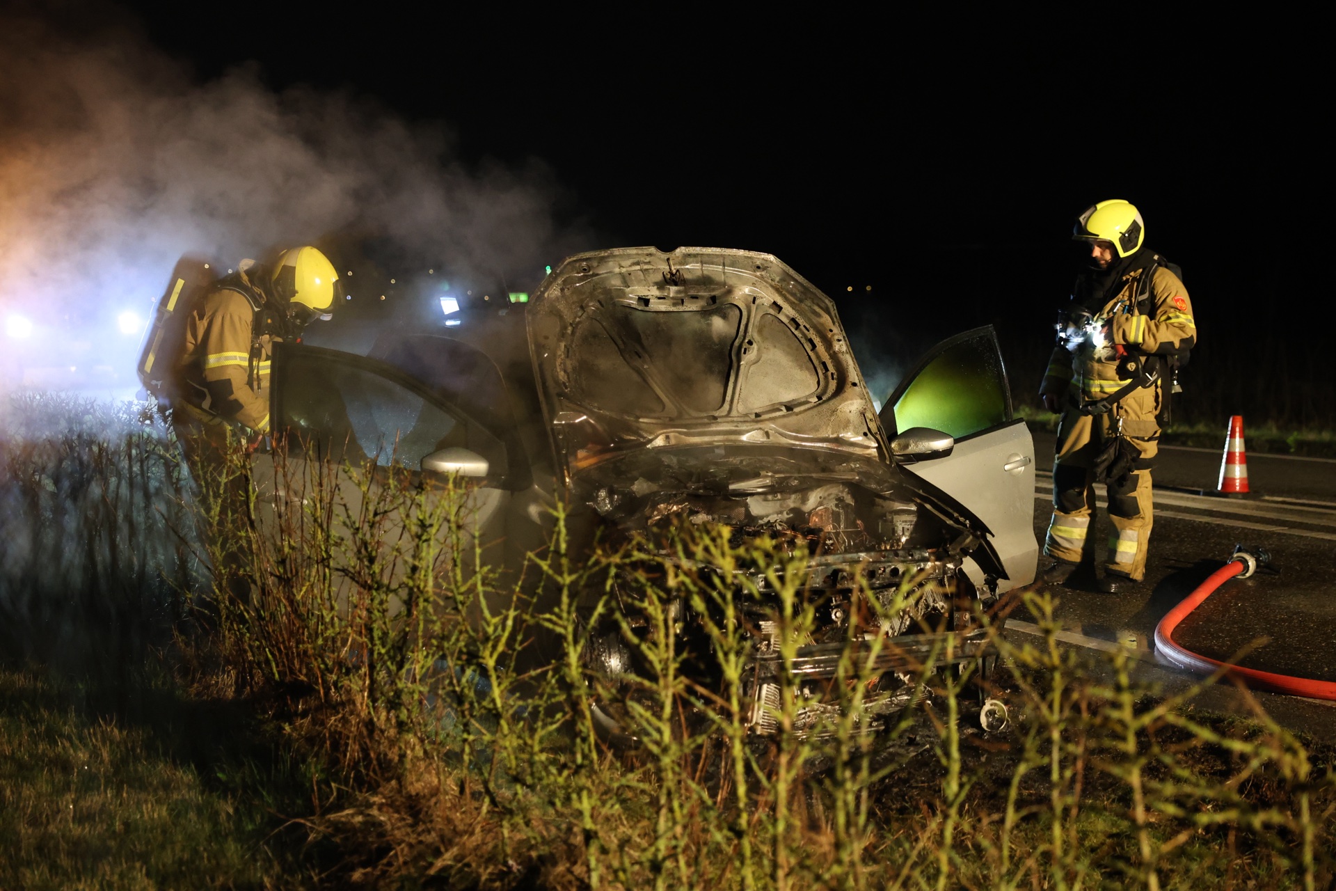De inzittende bleven ongedeerd, de auto werd aan de kant van de weg tot stilstand gebracht. De toegesnelde brandweer doofde de vlammen. Een gealarmeerde watertankwagen met extra bluswater kwam nog ter plaatse maar is niet meer ingezet. De weg is tijdens de bluswerkzaamheden in beide richtingen volledig afgezet. De politie zorgde voor deze afzetting.