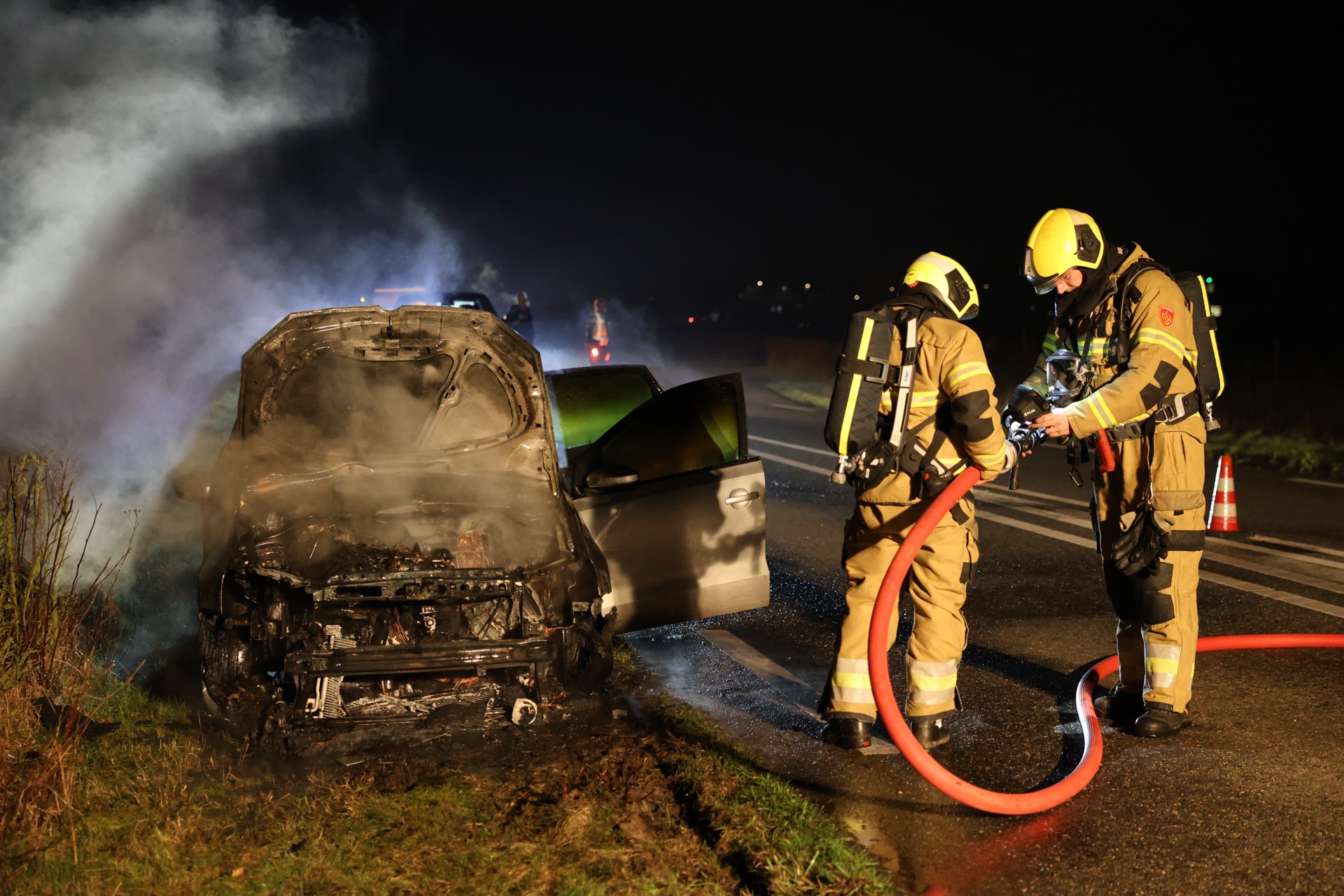 De inzittende bleven ongedeerd, de auto werd aan de kant van de weg tot stilstand gebracht. De toegesnelde brandweer doofde de vlammen. Een gealarmeerde watertankwagen met extra bluswater kwam nog ter plaatse maar is niet meer ingezet. De weg is tijdens de bluswerkzaamheden in beide richtingen volledig afgezet. De politie zorgde voor deze afzetting.