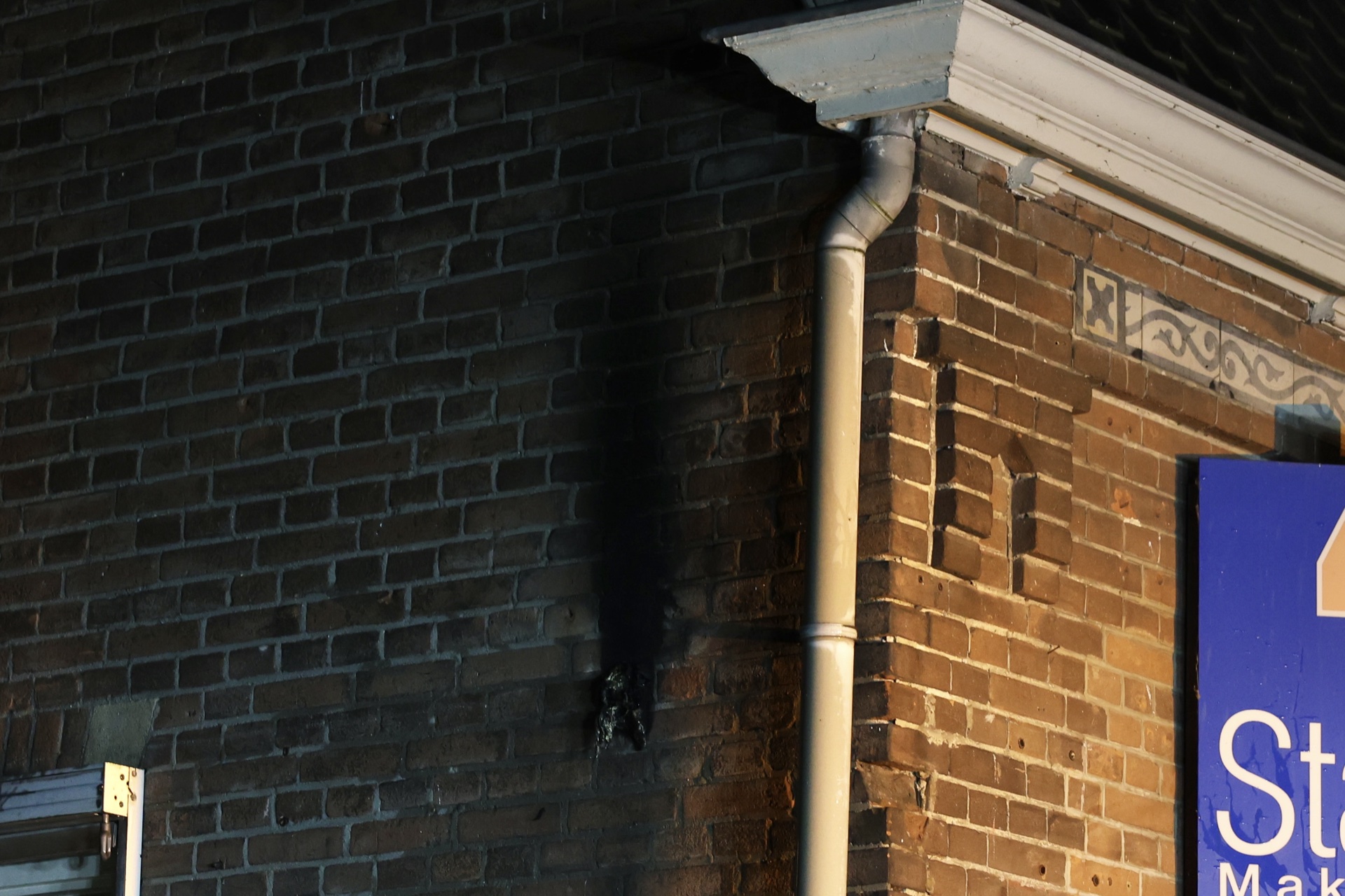 Schemerschakelaar aan gevel van makelaarskantoor vat vlam