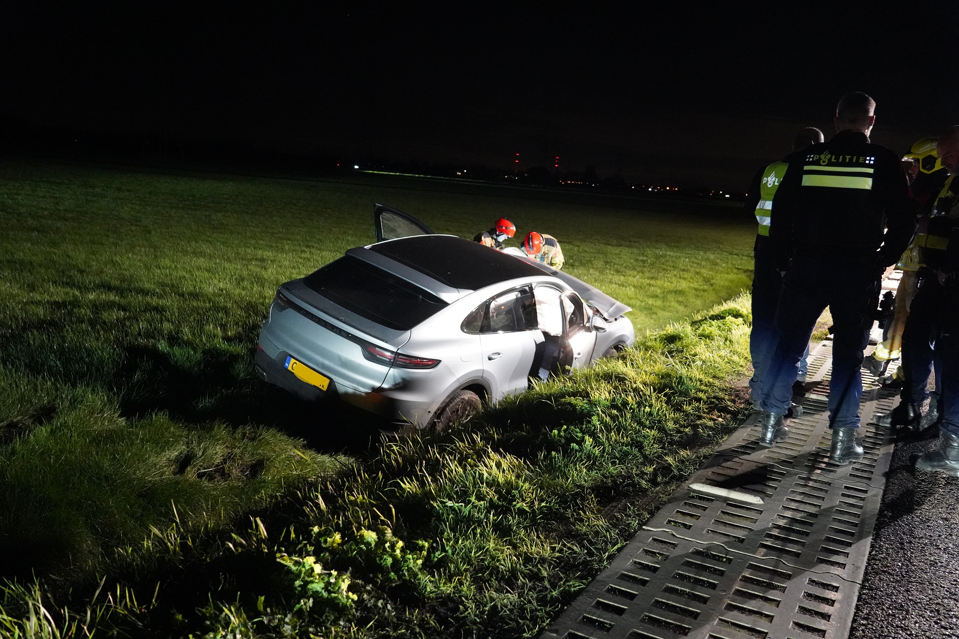Hij belandde met zijn auto naast de weg in een greppel. Meerdere brandweerwagens en ambulances rukten uit. Het slachtoffer werd in een ambulance behandeld. De brandweer zorgde ervoor dat de accu van de auto werd afgekoppeld.