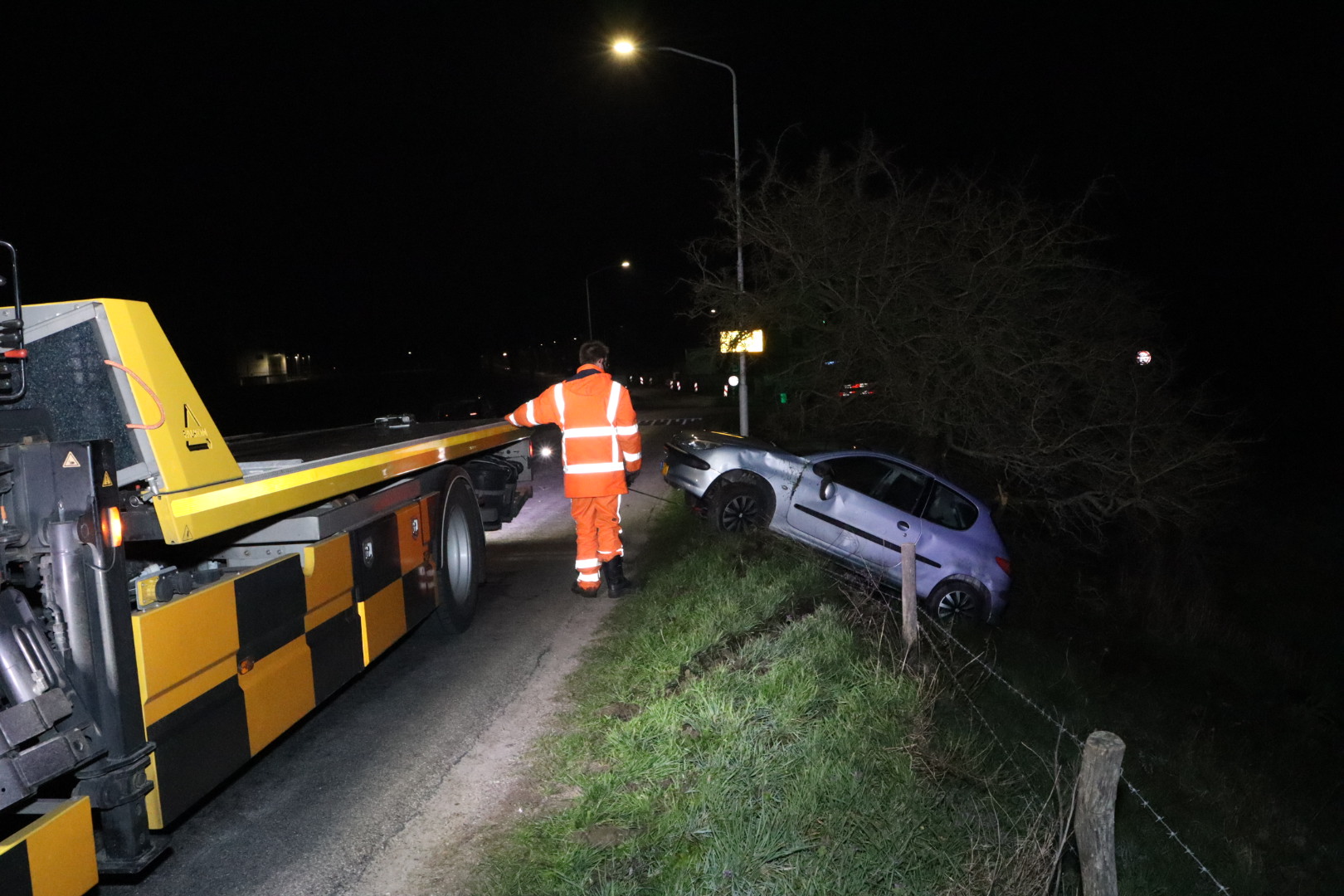 Voorbij de brug in de bocht was de bestuurder de macht over het stuur verloren, en reed van het talud af. De bestuurder en een inzittende waren door omstanders uit hun auto gehaald. Beide kwamen met de schrik vrij. De inzittende is na verhoor met de politie door een omstander thuisgebracht.