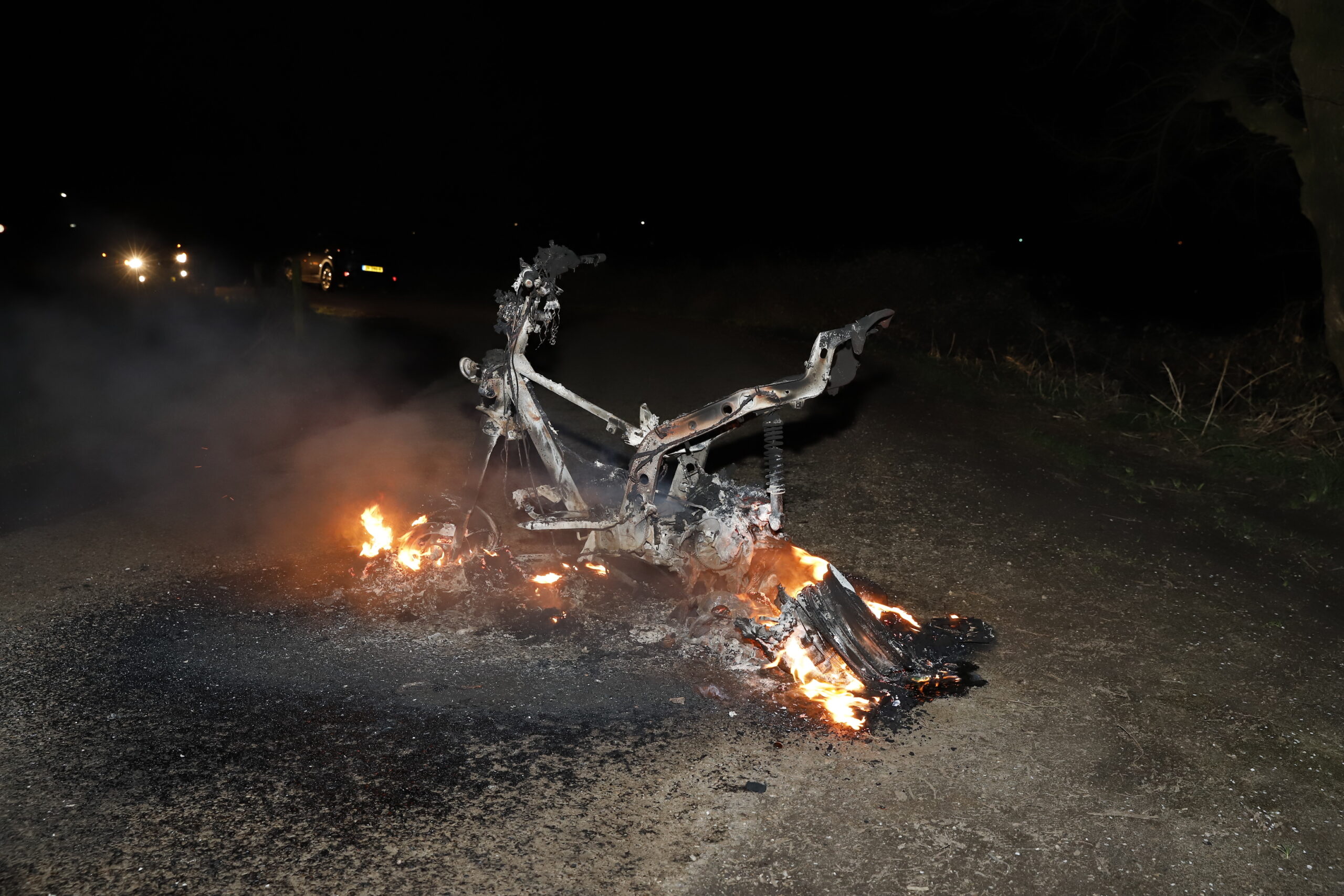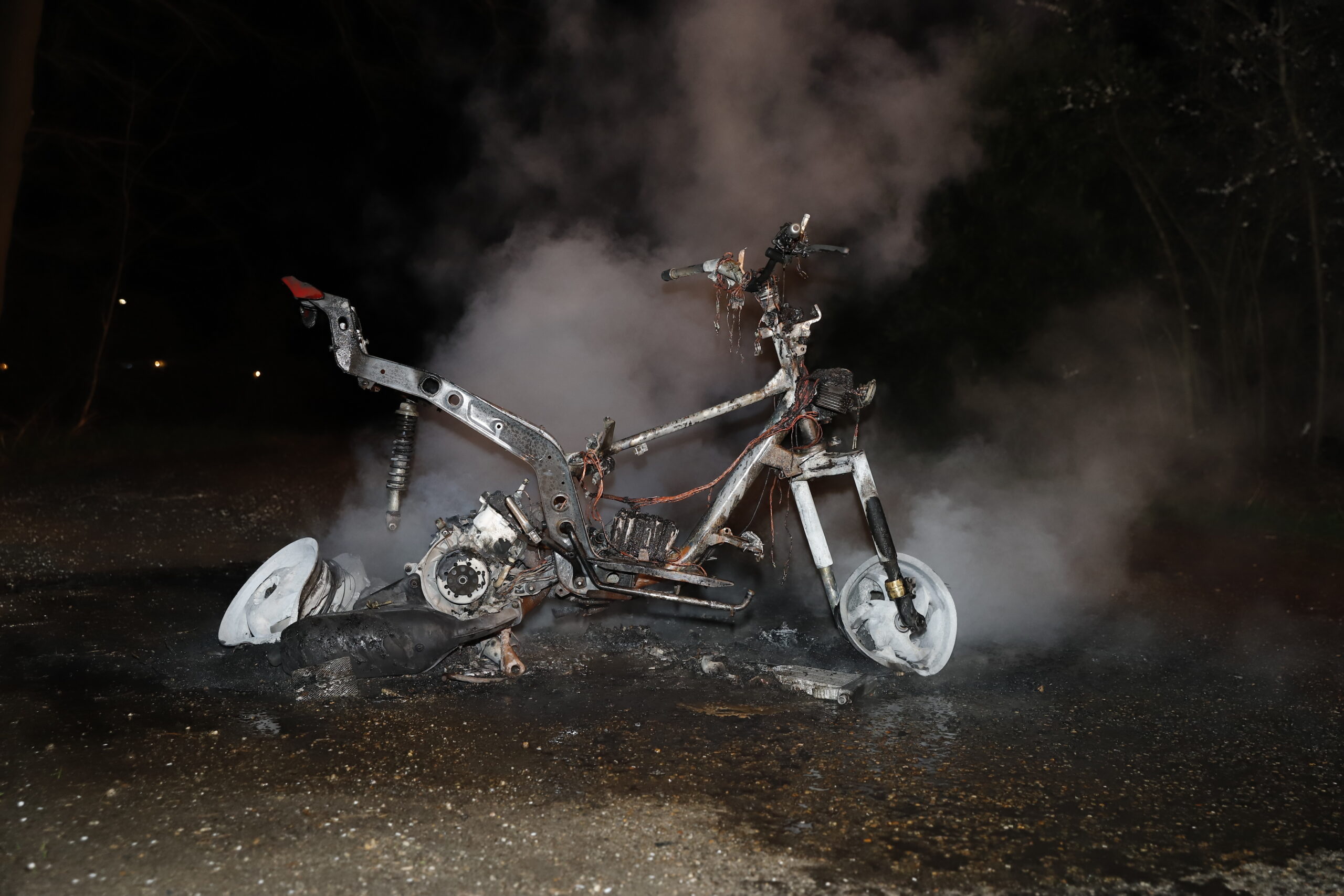 De scooter stond op een afgelegen weg midden op straat. De brandweer heeft de scooter geblust, de politie doet onderzoek naar de afkomst van de scooter.