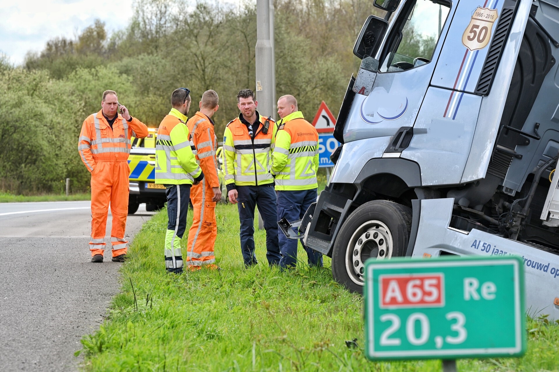 Rijkswaterstaat en de brandweer zijn ter plaatse gekomen en hebben de afrit afgezet. Er is een bergingsvoertuig onderweg om de vrachtwagen te bergen.