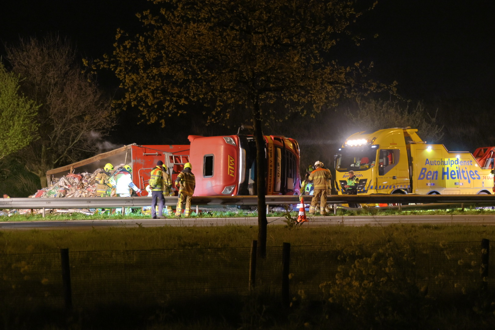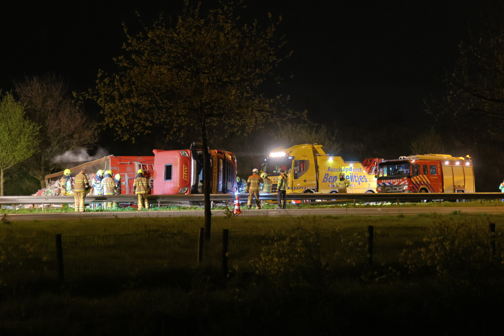 Vrachtwagen gekanteld, snelweg helemaal dicht
