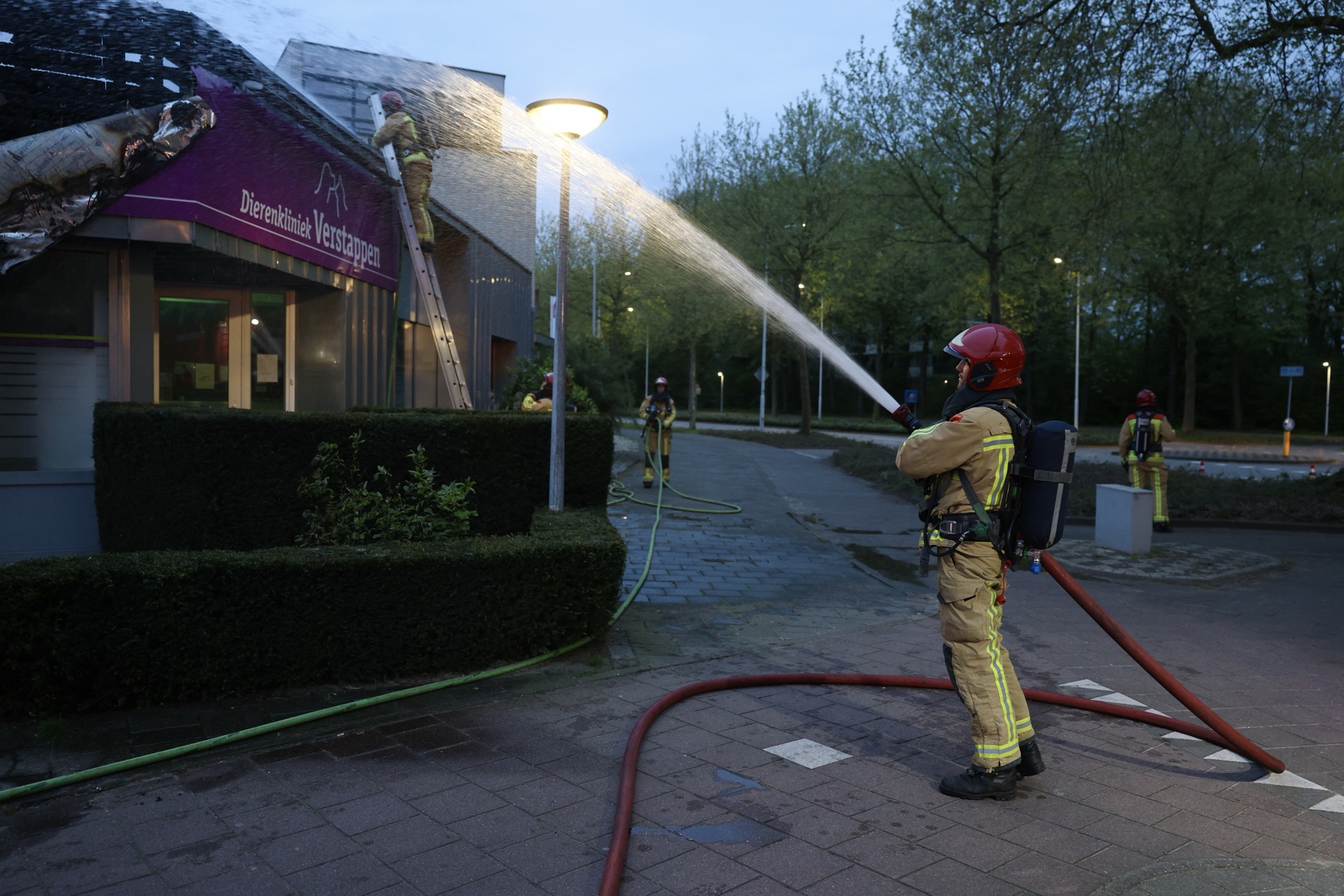 Geplaatst op 14 april 2024, om 08:33 uurBEST – In Best is de brandweer op De Ronde een tweetal containers aan het blussen. Omdat het vuur is overgeslagen op het gebouw van Dierenkliniek Verstappen is een tweede tankautospuit ter plaatse gekomen en een hoogwerker.