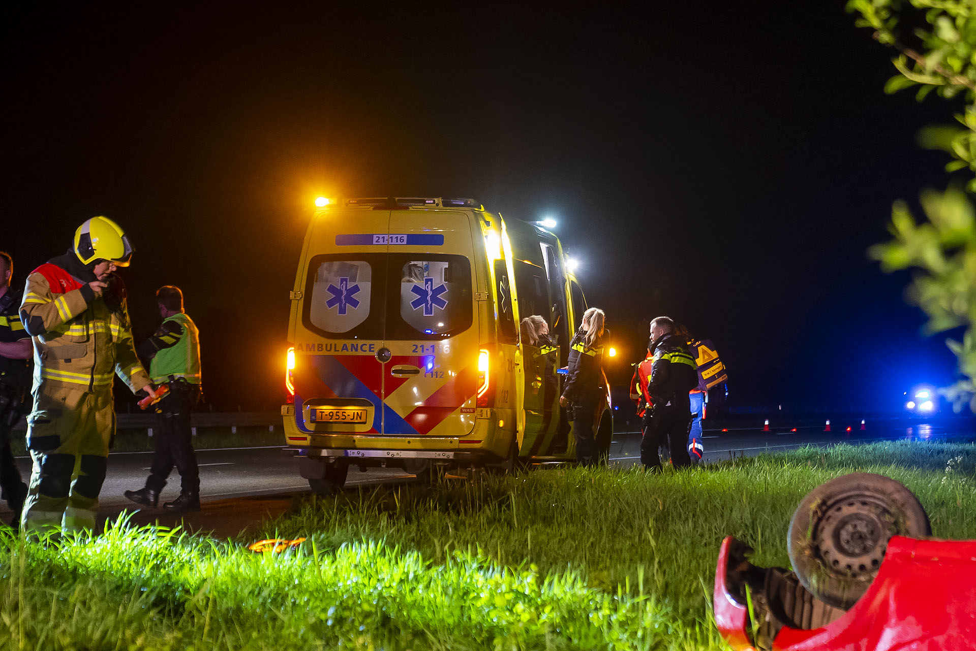 Een auto raakte rond 1.40 uur ter hoogte van Schaijk van de weg, sloeg over de kop en kwam ondersteboven in een sloot terecht. Het voertuig raakte zwaar ebschadigd. De hulpdiensten rukten meteen met groot materieel uit. Behalve de politie en ambulancedienst werden ook de brandweer en een traumahelikopter opgeroepen. De helikopter landde op de snelweg waardoor die enige tijd volledig afgesloten moest worden voor het verkeer.