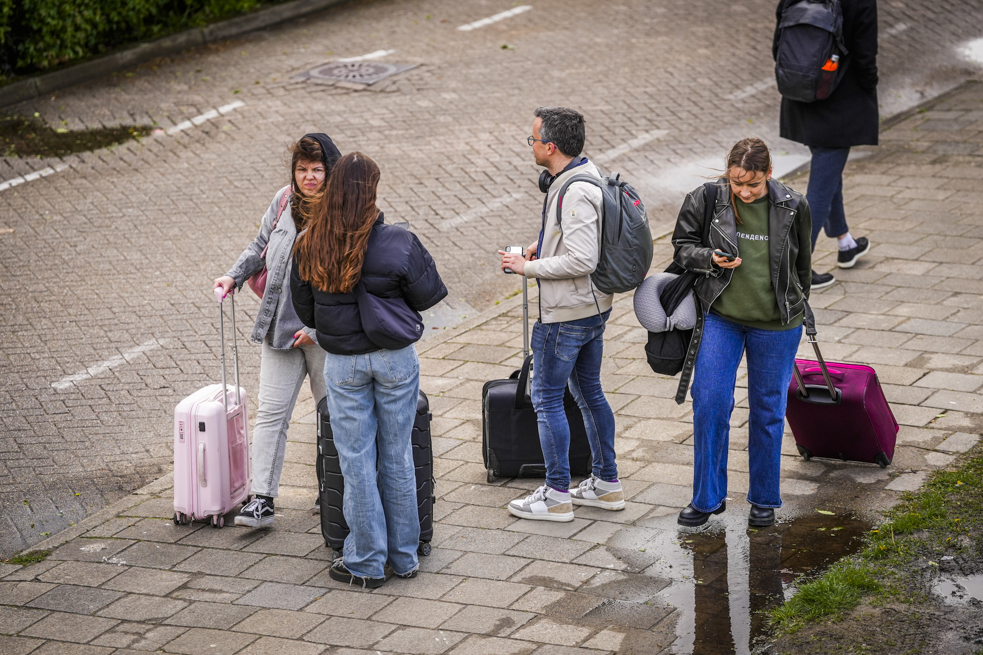 Reizigers op Station Strijp-S wachten af of regelen alternatief vervoer, terwijl anderen besluiten naar het centraal station te lopen. Ook van daaruit zijn treinen naar het noorden voorlopig stopgezet.