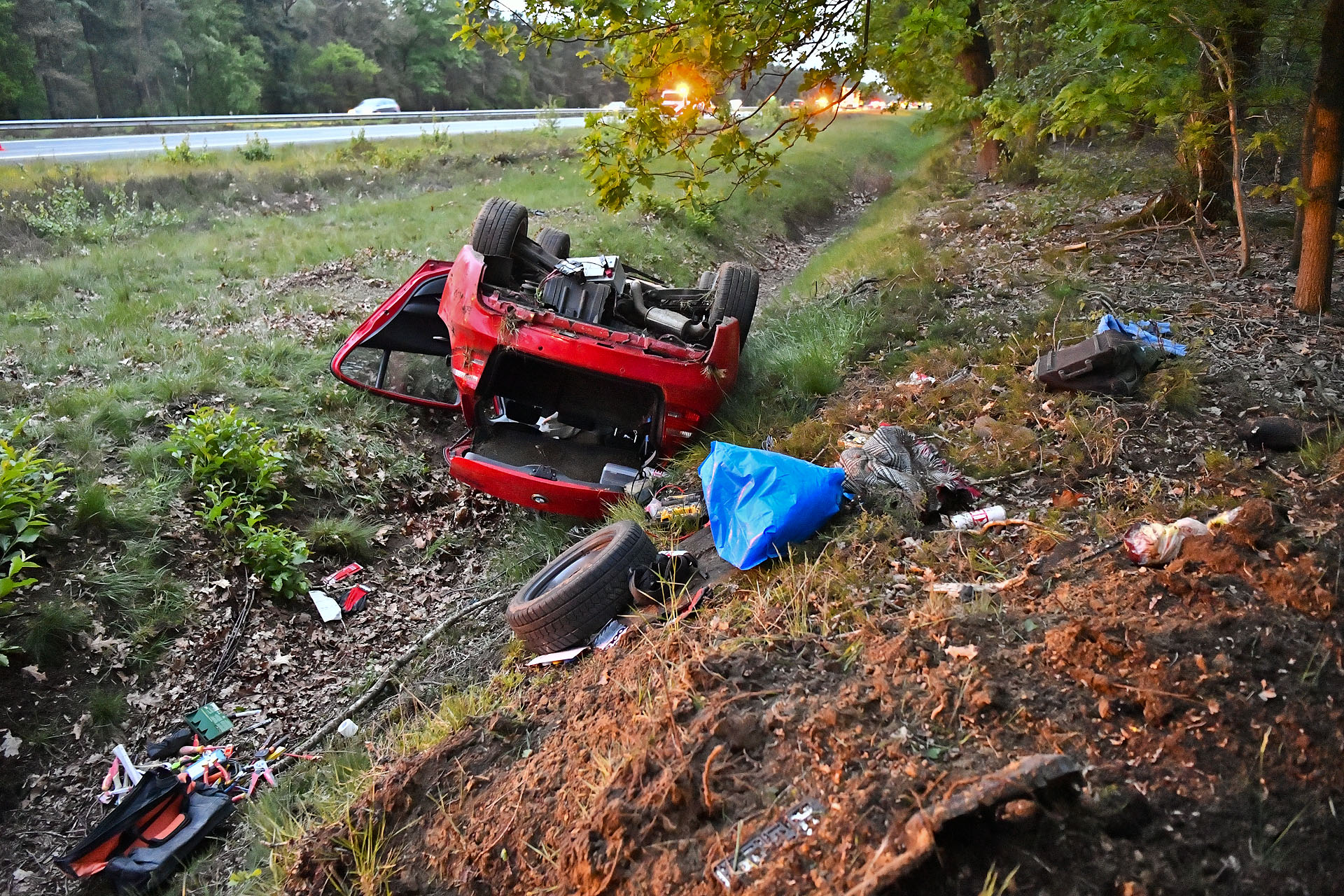 Een auto werd van achteren geraakt en belandde op de kop in de sloot. Het veroorzakend voertuig reed al slingerend nog 150 meter door de berm en over de weg en belandde met de neus in de sloot. Beide bestuurders zijn nagekeken in de ambulance. Beiden mankeerden niets qua letsel. De jongedame die 150 meter verder met haar voertuig strandde is door de politie geboeid meegenomen achterin de politieauto vanwege artikel 5 van de wegenverkeerswet.