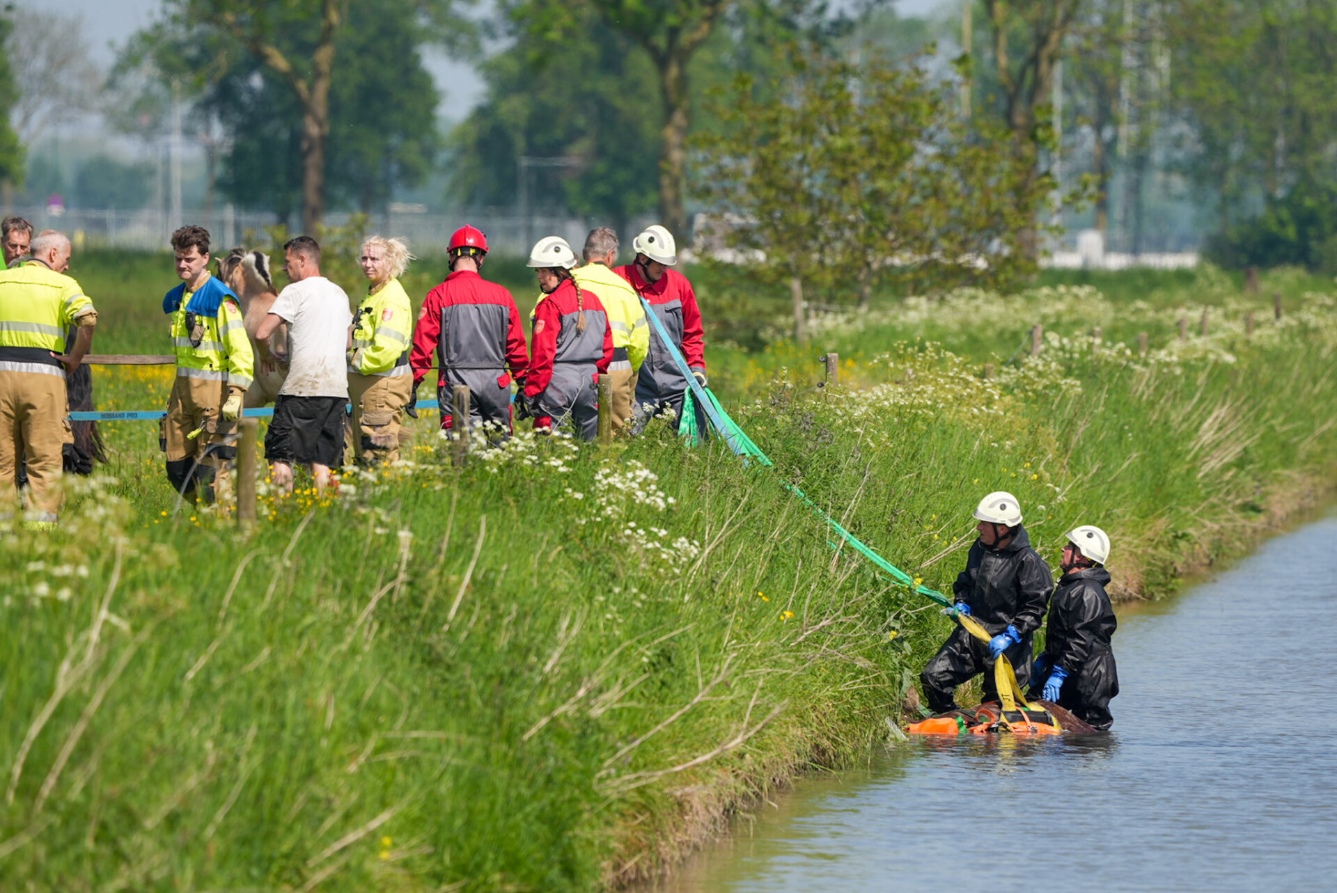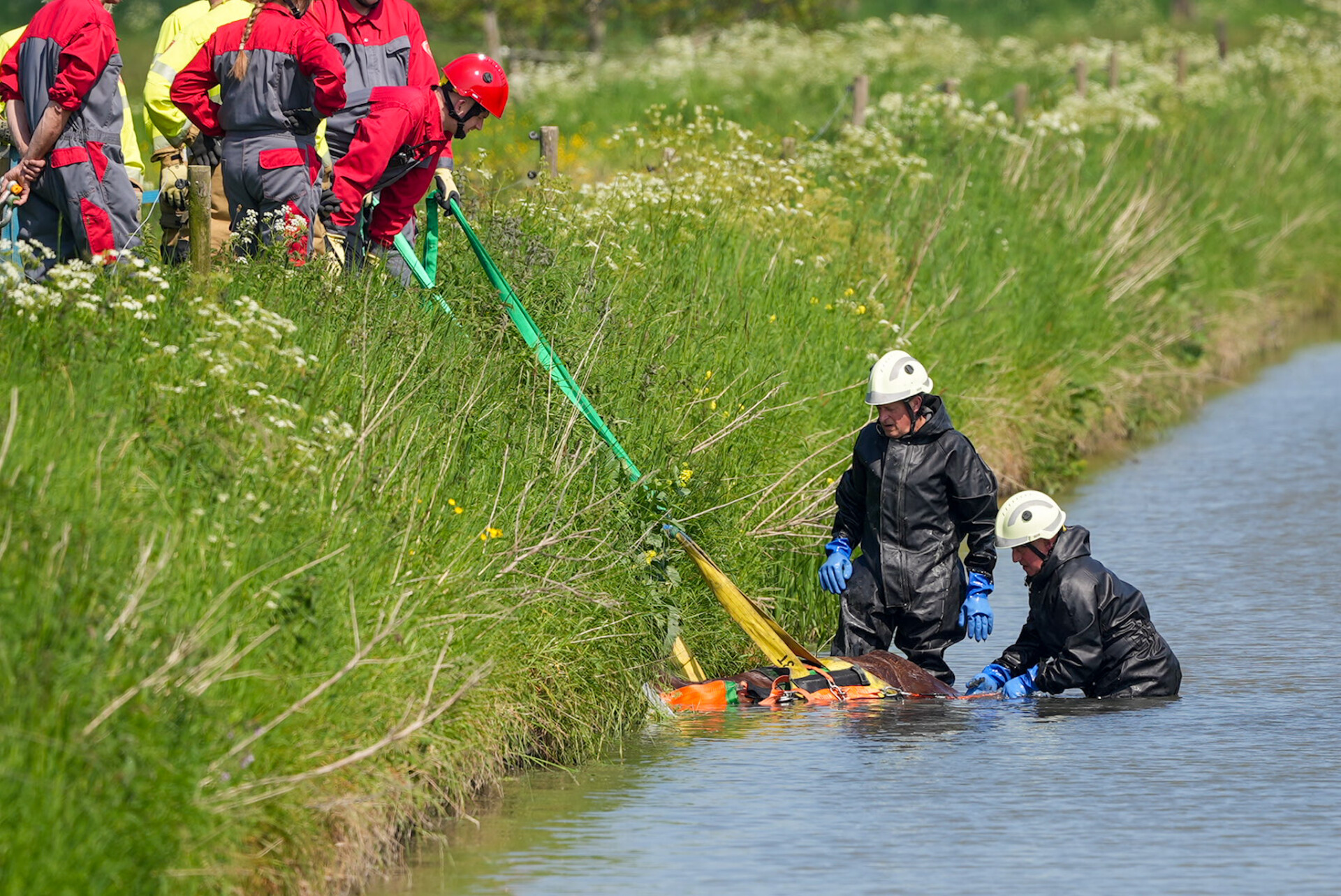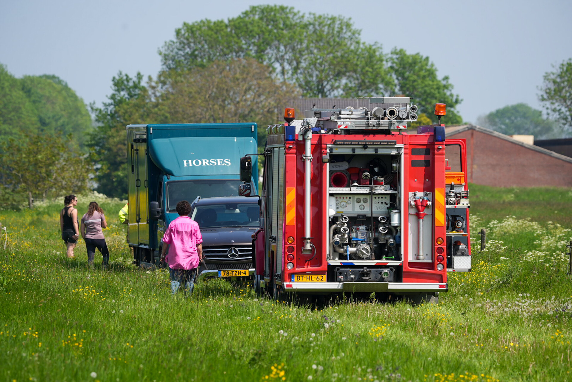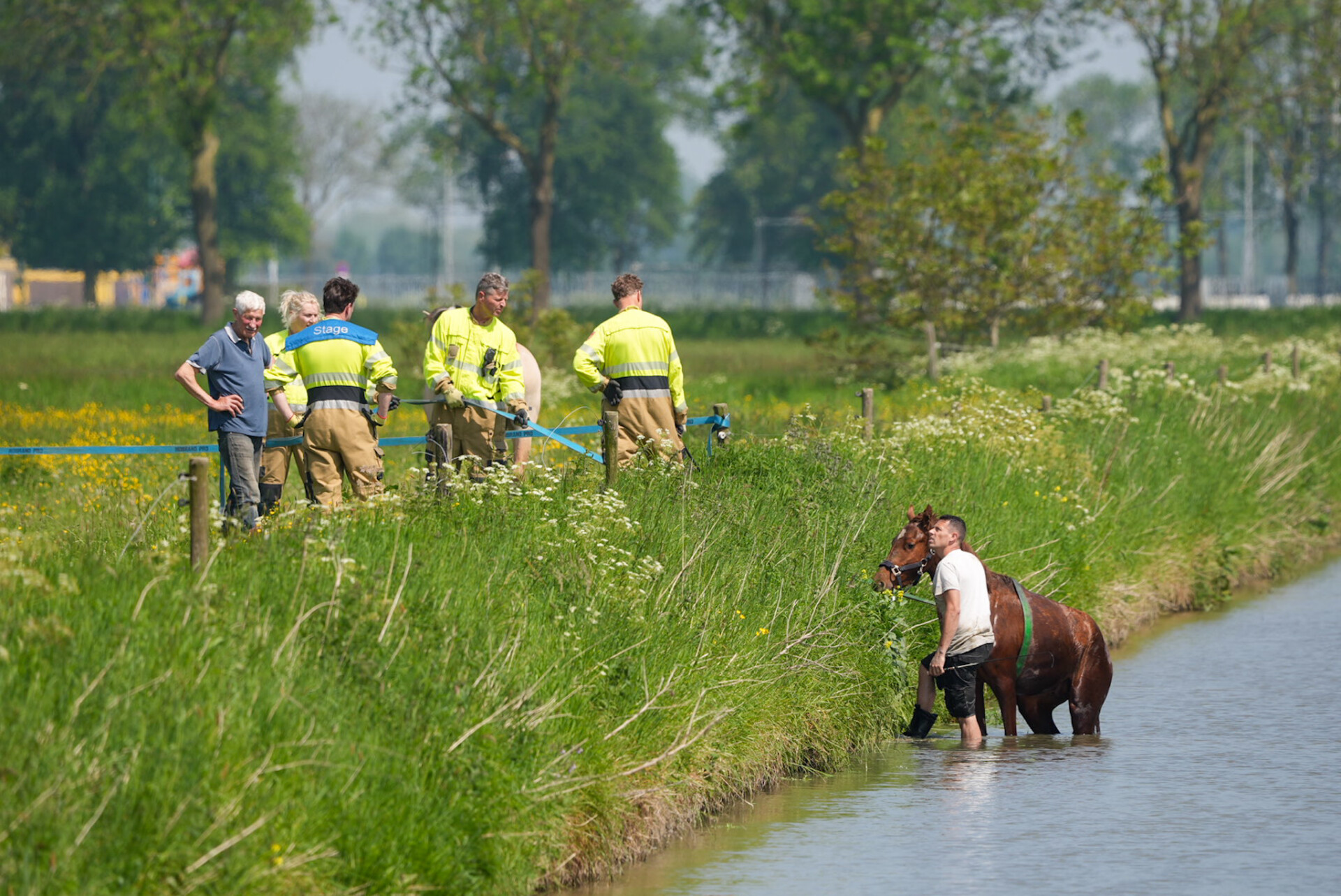 De brandweer was ter plaatse met twee voertuigen. Samen met een omstander, die in het water stond, probeerden zij het paard aanvankelijk met een touw uit de sloot te halen.