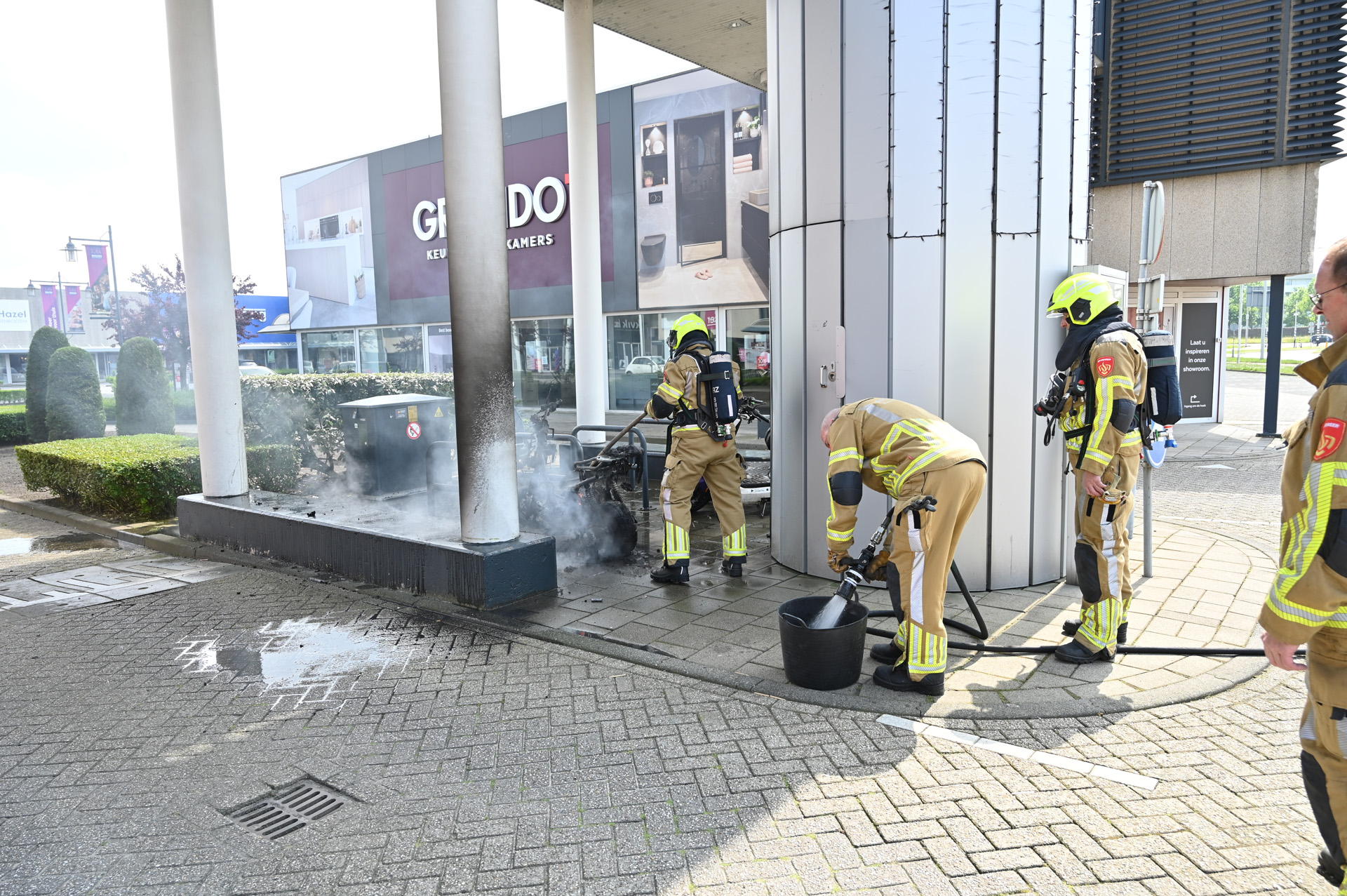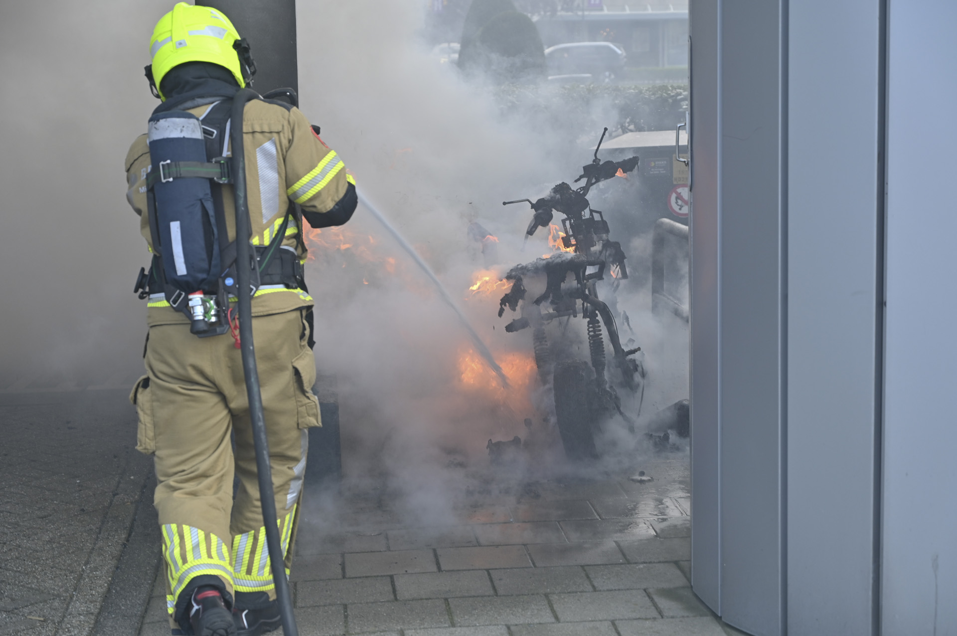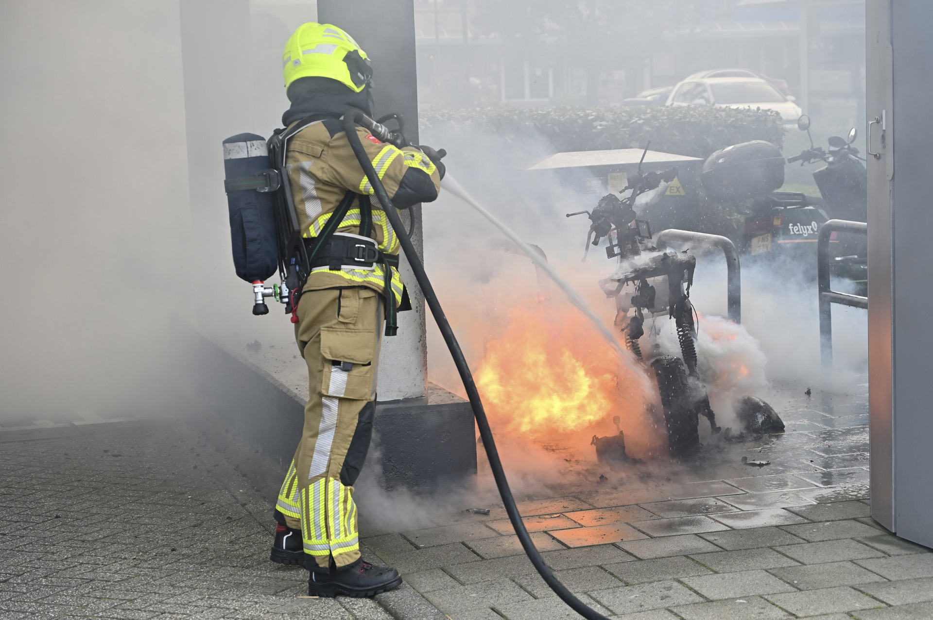 De brandweer was snel ter plaatse maar kon niet voorkomen dat de scooter verloren ging. Ook twee andere scooters die er naast stonden geparkeerd liepen brandschade op. De brandweer heeft de accu’s verwijderd en in een plastic bak geplaatst.