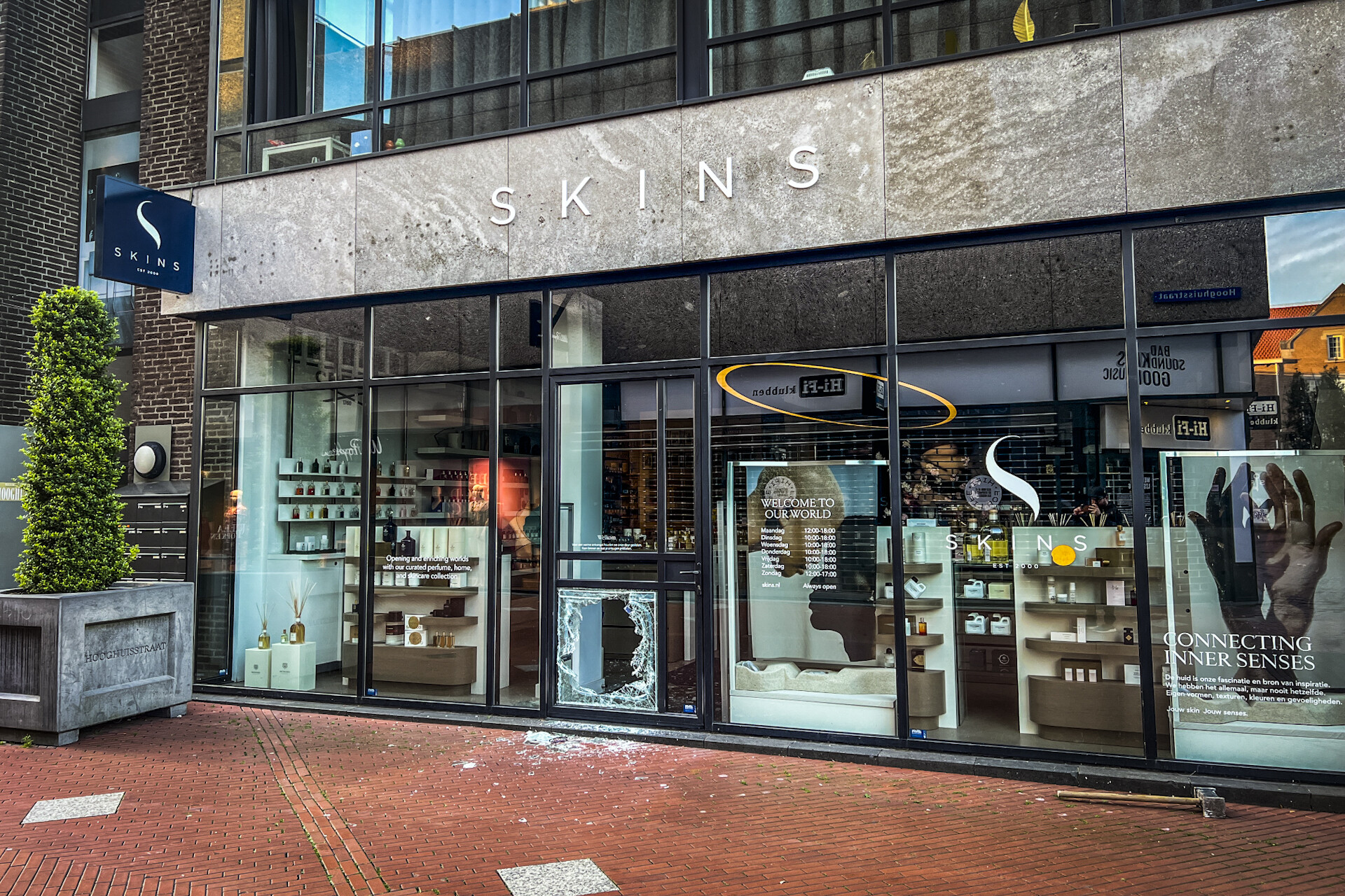EINDHOVEN – Dinsdagochtend hebben inbrekers bij cosmeticawinkel Skins aan de Hooghuisstraat in Eindhoven met een moker een ruit ingeslagen en zijn via de kapotte ruit naar binnen gegaan.