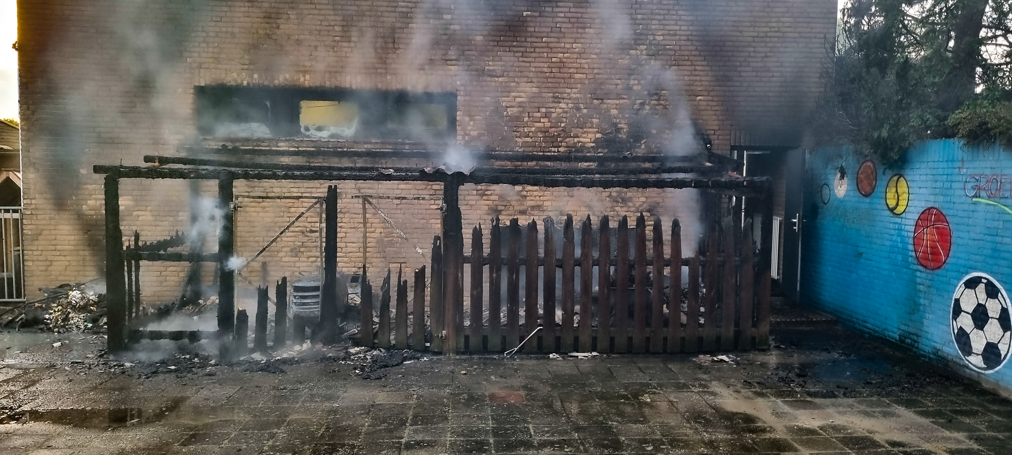 Bij aankomst bleek een schuur in brand te staan. De brandweer kon voorkomen dat het vuur oversloeg naar de buitenschoolse opvang De Tovertuin. Desondanks heeft De Tovertuin roet- en waterschade opgelopen.