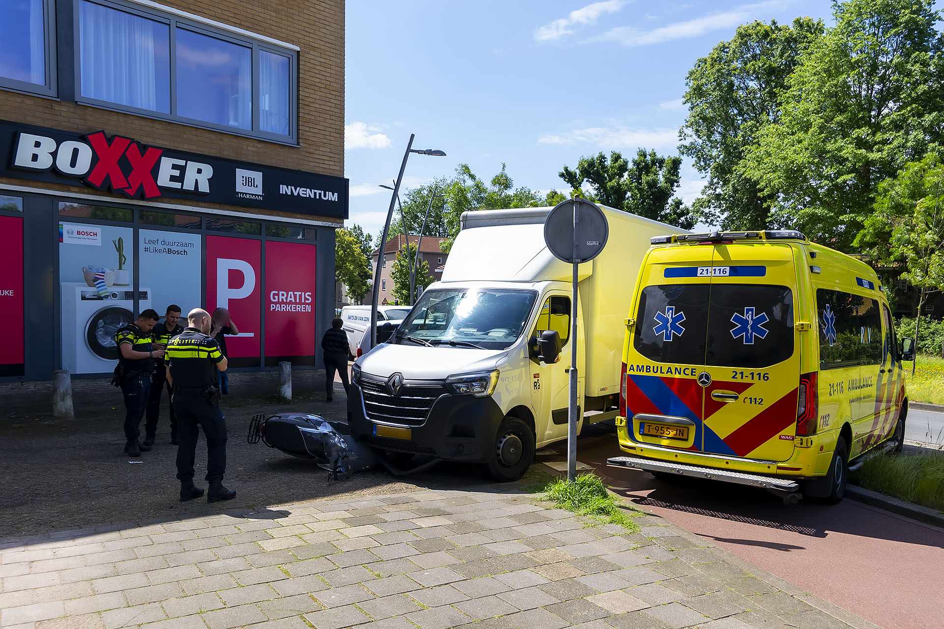 Vermoedelijk zag de bestuurder de scooter ondanks de bij de inrit geplaatste verkeersspiegel over het hoofd. Het slachtoffer liep in elk geval letsel op aan zijn kin maar kon ter plekke worden geholpen door ambulancepersoneel. Hij hoefde niet mee naar het ziekenhuis. Beide voertuigen raakten zwaar beschadigd.