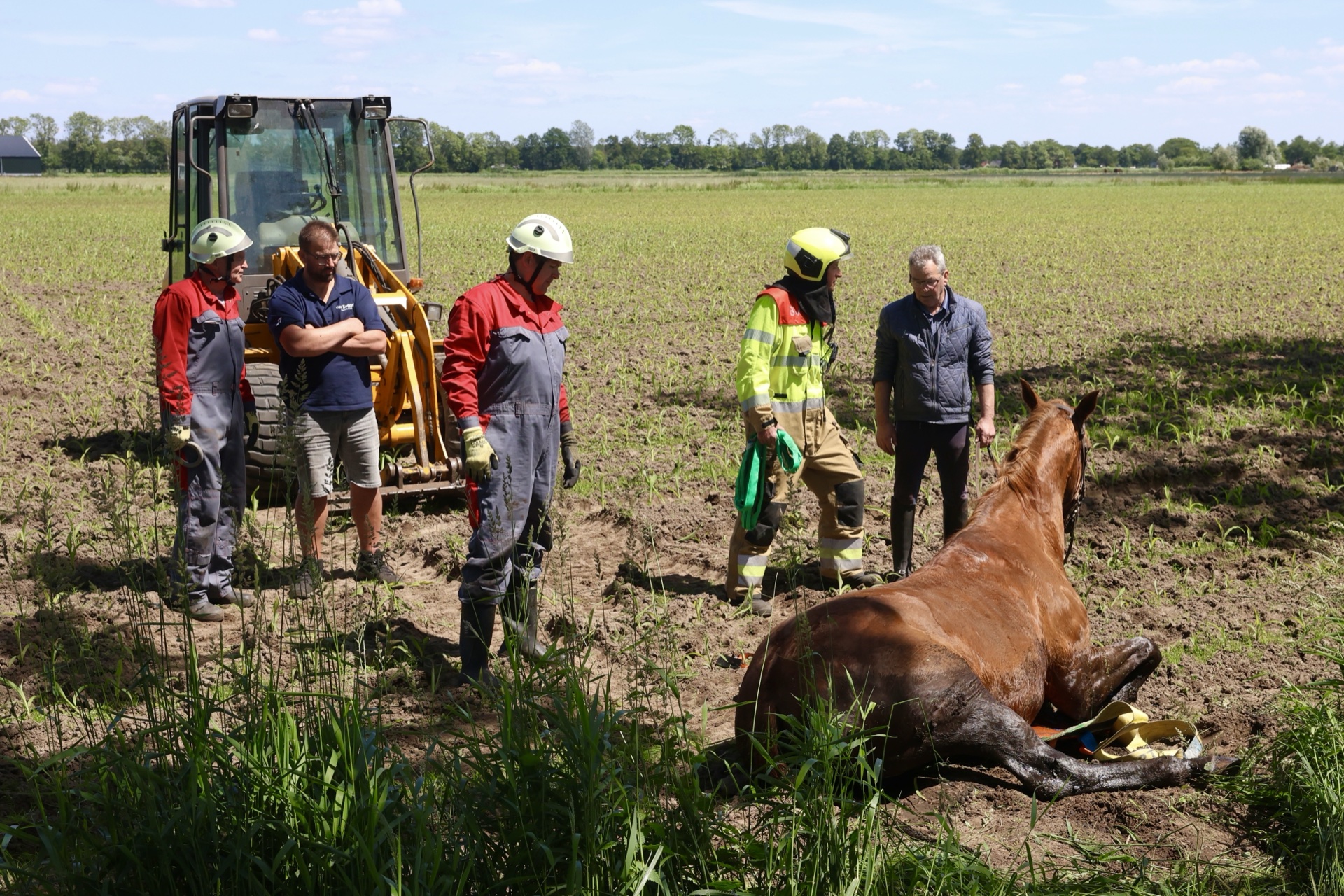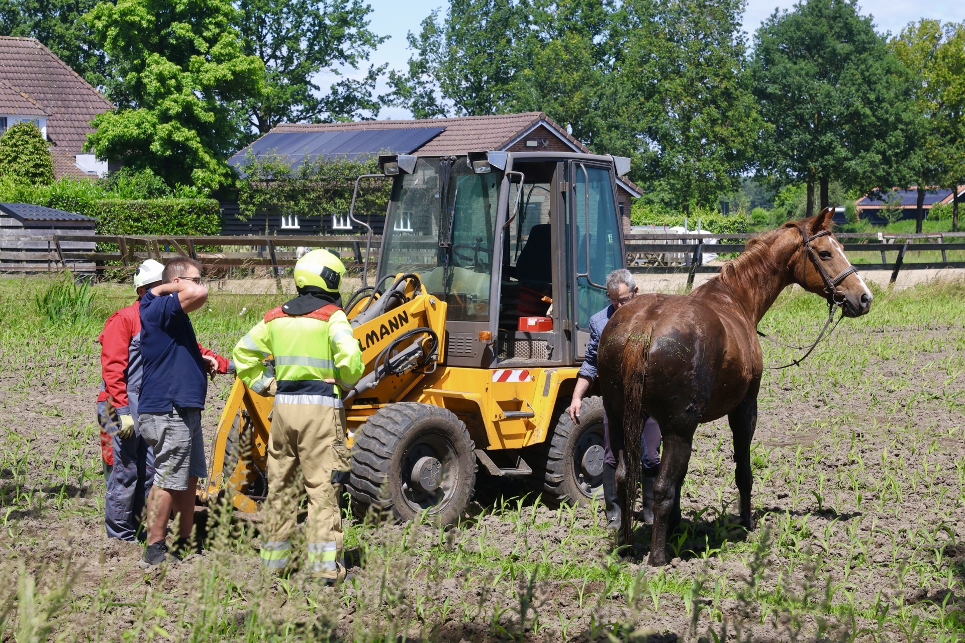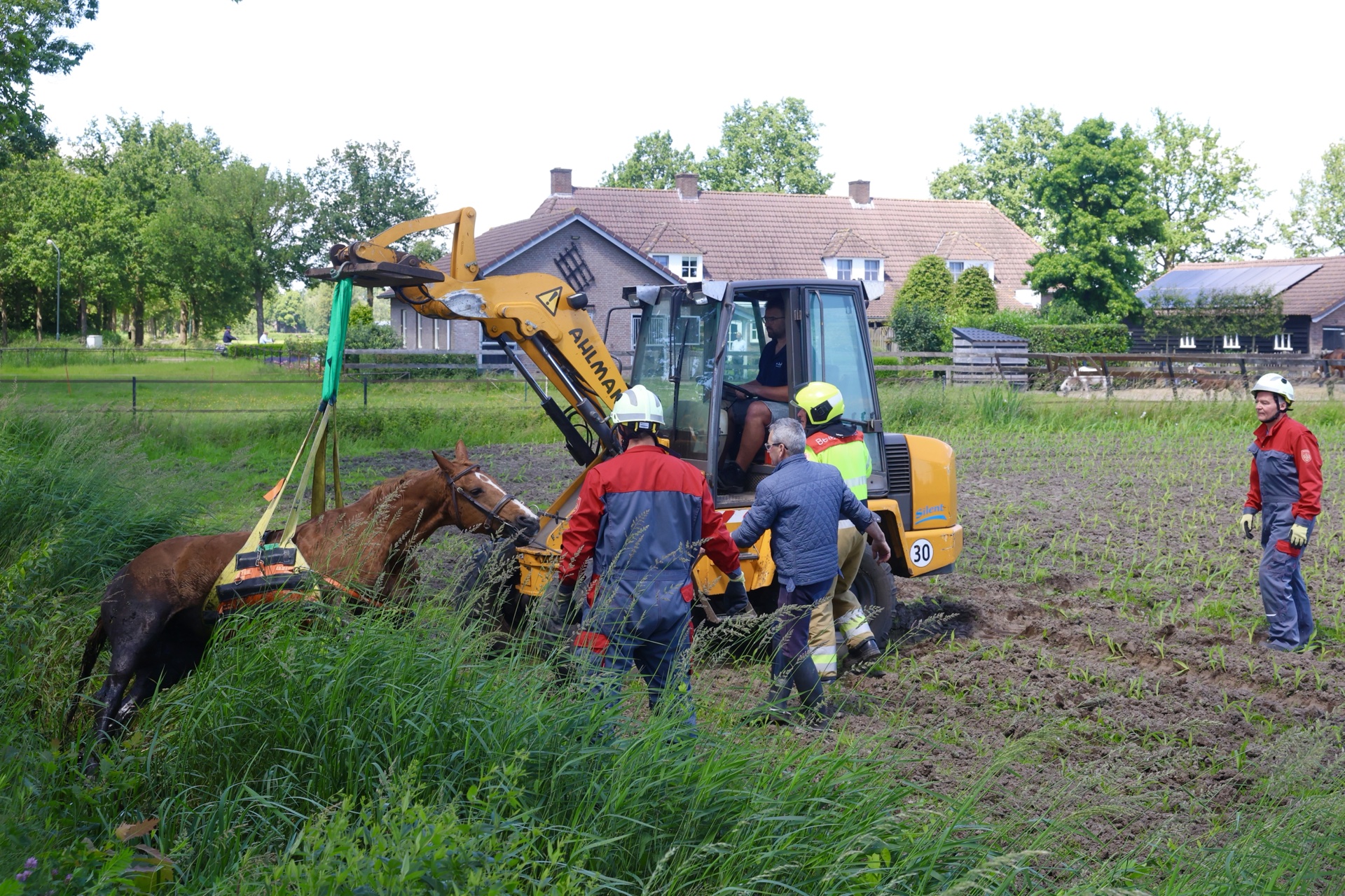 Het paard was samen met de ruiter in de sloot beland na een schrikreactie. De man bleef ongedeerd, maar het paard kon niet zelfstandig uit de sloot komen. Met hulp van de brandweer en een klein landbouwvoertuig werd het paard bevrijd. Enkele passanten keken toe. Na de redding liep het paard samen met de ruiter naar huis.